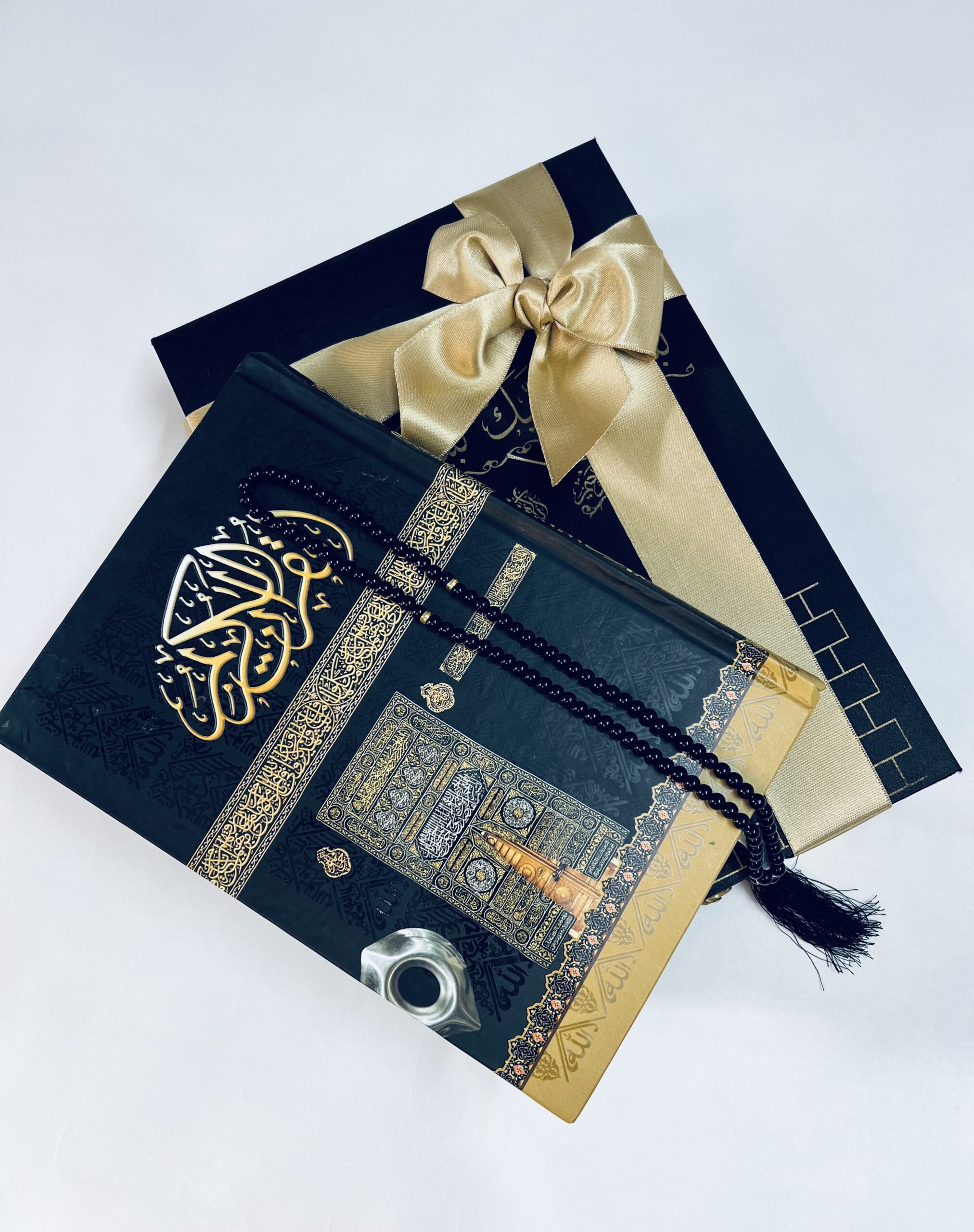 In this luxurious black Kaba gift set, the Holy Quran is presented in a special box resembling the Holy Kaba! This case is made out of black velvet or Chenille and features Arabic calligraphy in gold detailing like that on the Kaba. Not only is it great for showcasing the Holy Quran, but it also is a great place to store the included Quran and black 99 beads tasbih!