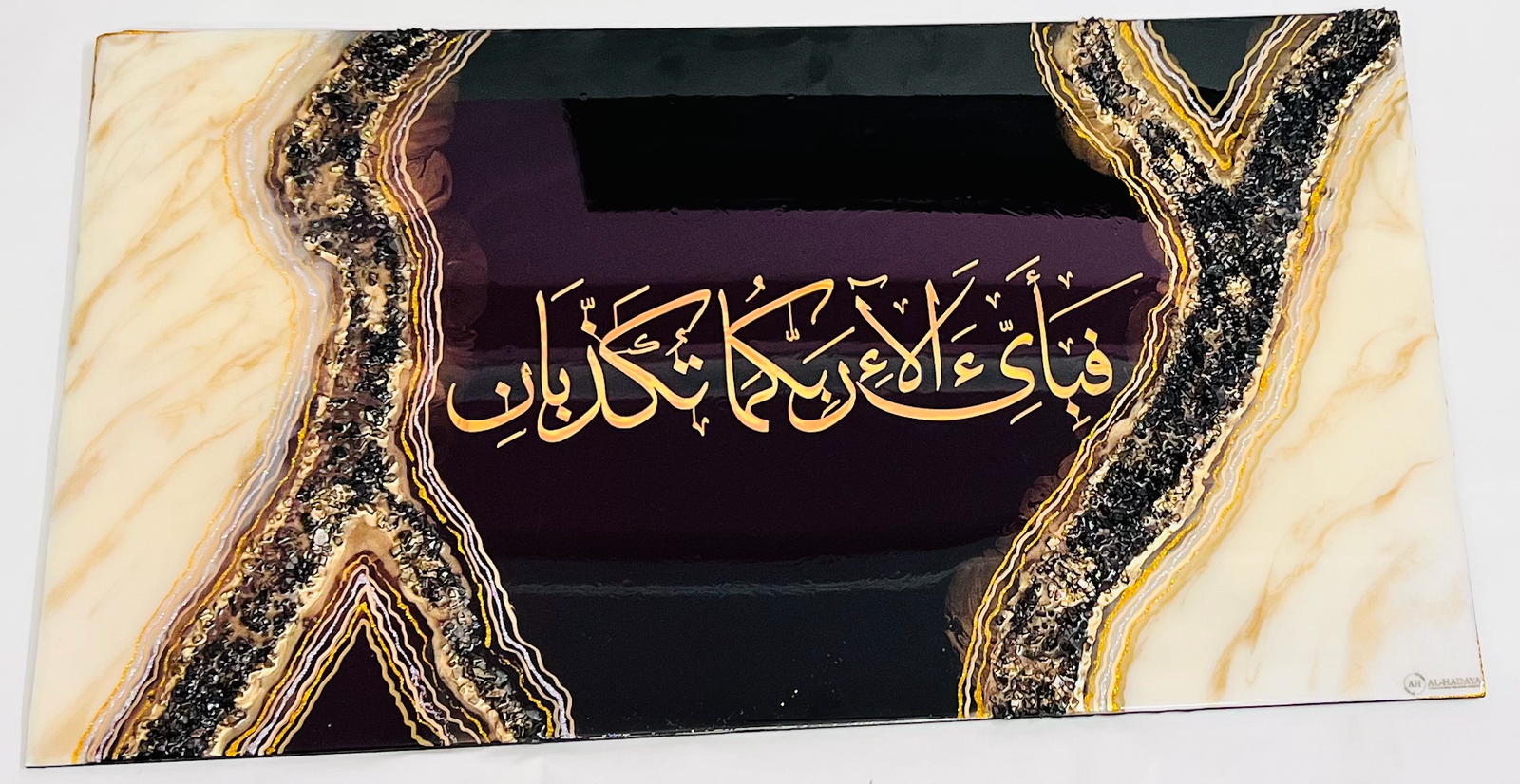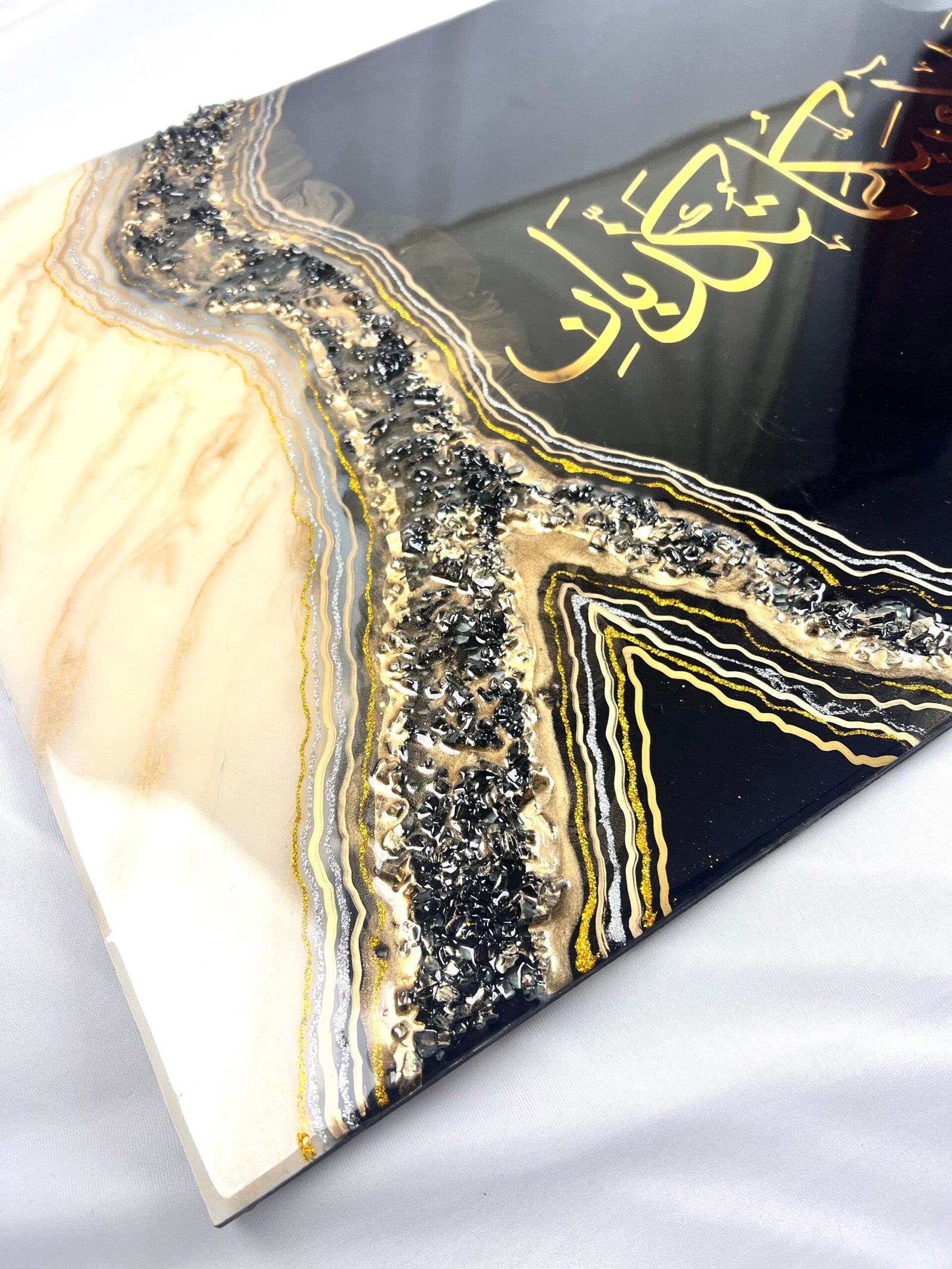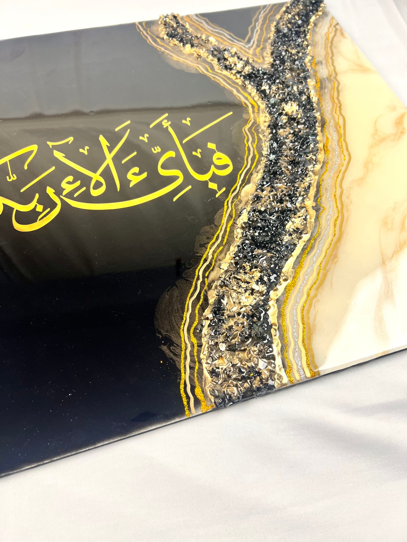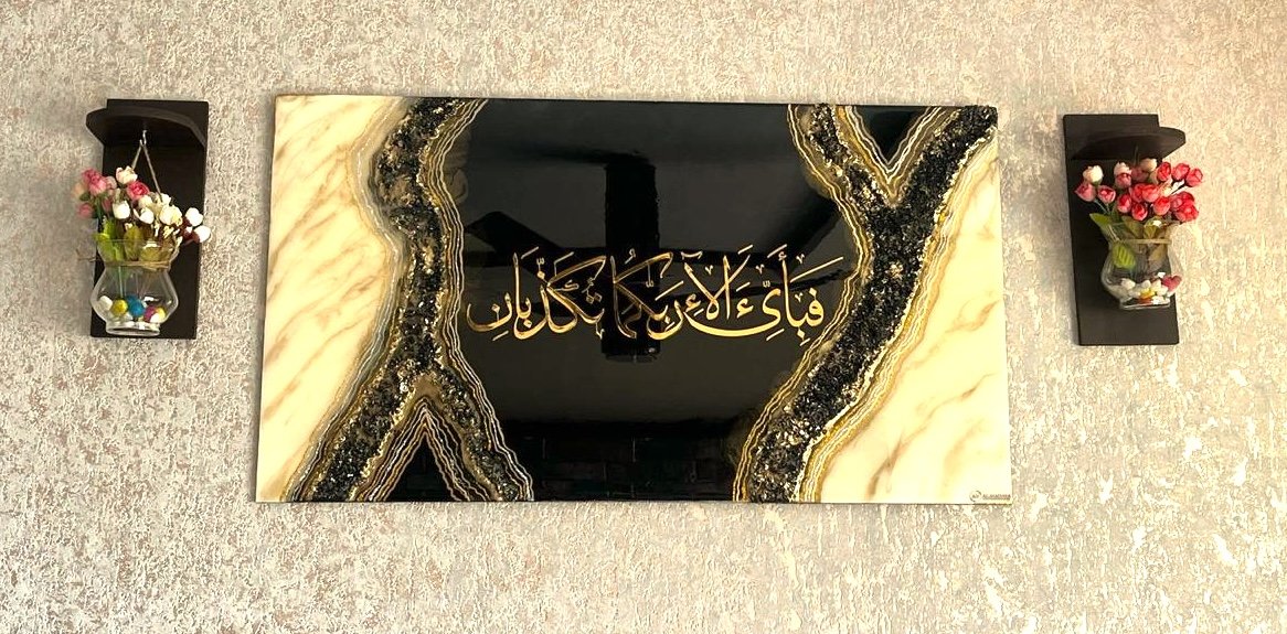 - Surrounding the calligraphy is a stunning geode resin art design, with Colours inspired by nature’s precious stones—rich shades of Black, gold, Off-white, and other natural hues that create a sense of movement and depth.