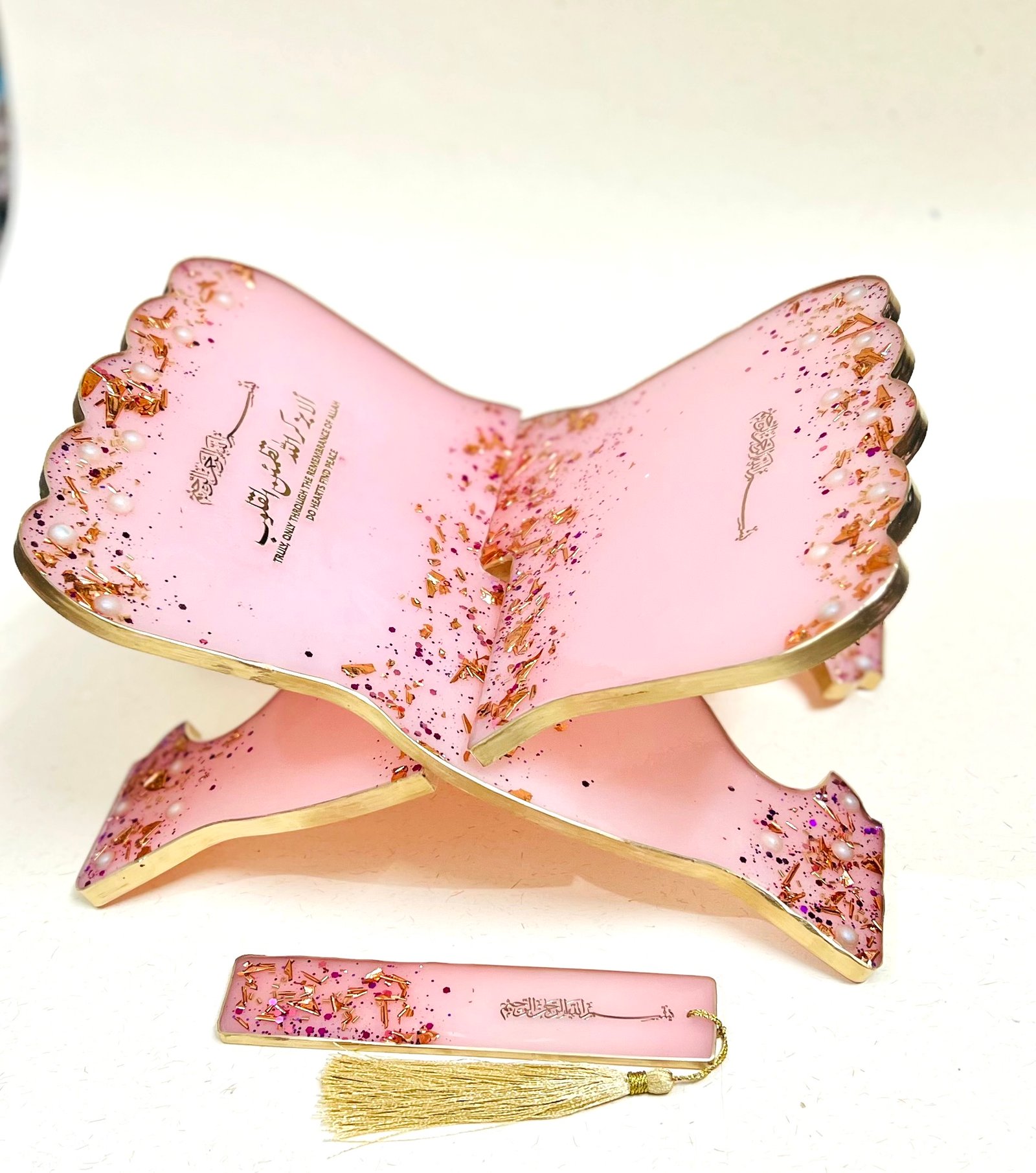 Size: Approx. 24.5cm x 18.5cm x 3.5cm) - Resin Rahel: A delicate Quran holder for your cherished verses. Delicately handcrafted to perfection in hues of rich pastel pink, adorned with Bismillah and Quranic Verses. (Size: Approx. 28cm x 20cm)