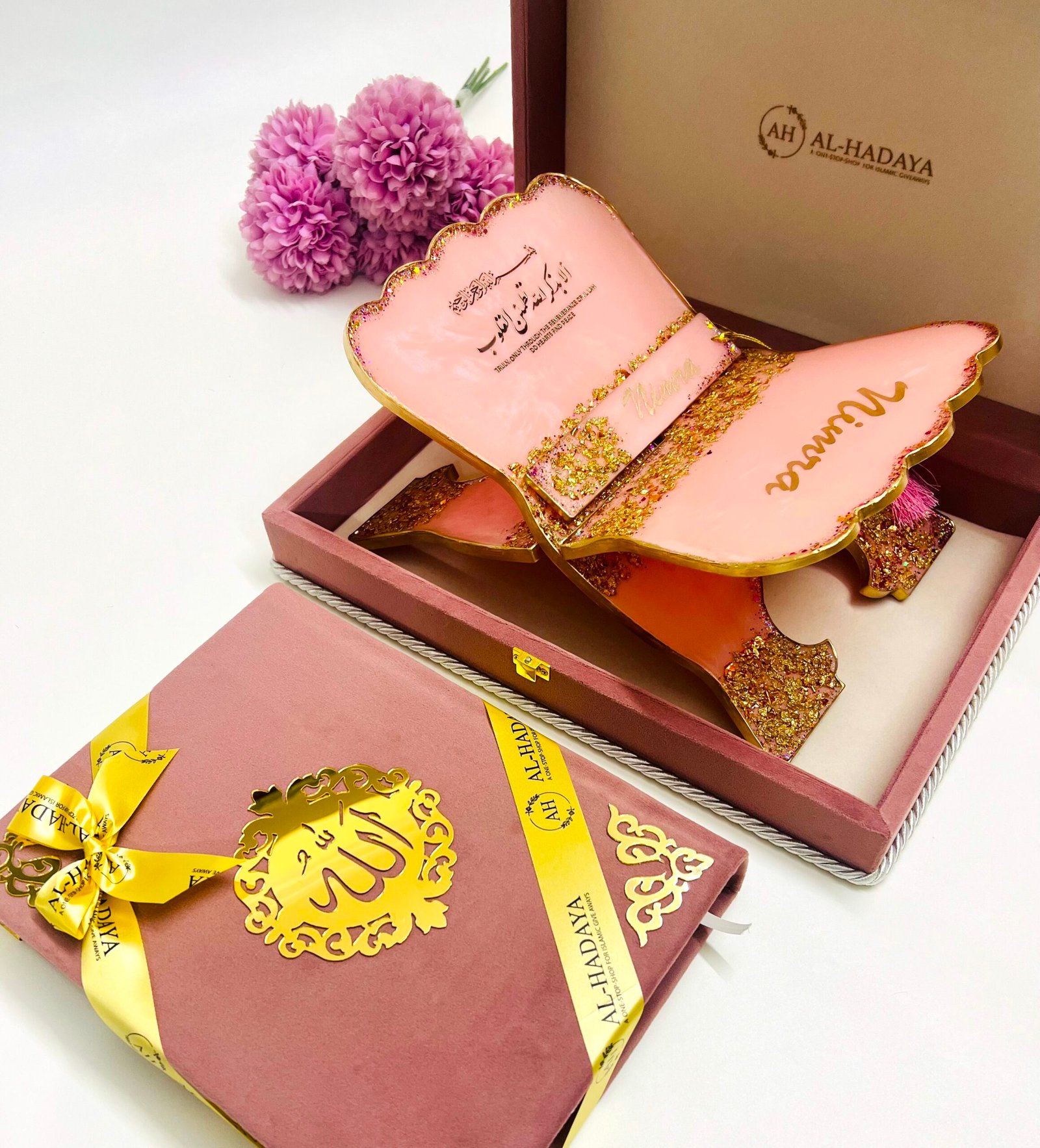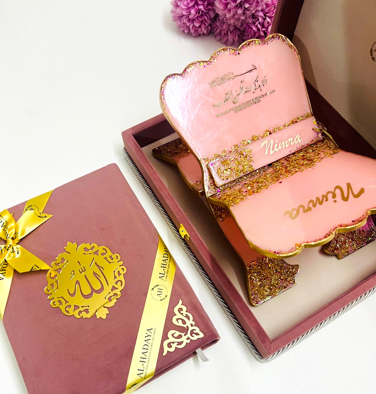 Introducing our exquisite Lavish Rehal & Quran Gift Hamper in Pastel Pink theme, a blend of opulence and spirituality. Crafted with the finest velvet and adorned with intricate resin work, this masterpiece is designed to elevate your Quran reading experience. Discover the perfect blend of elegance and reverence in every page. Elevate your spiritual journey with this exceptional piece of art.