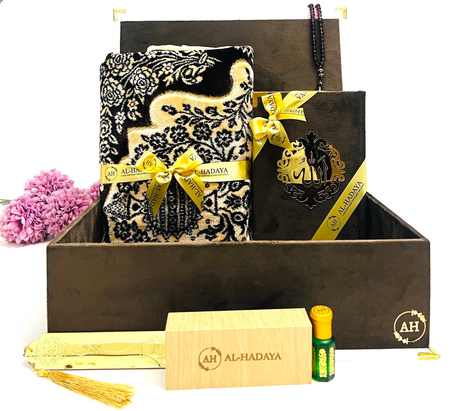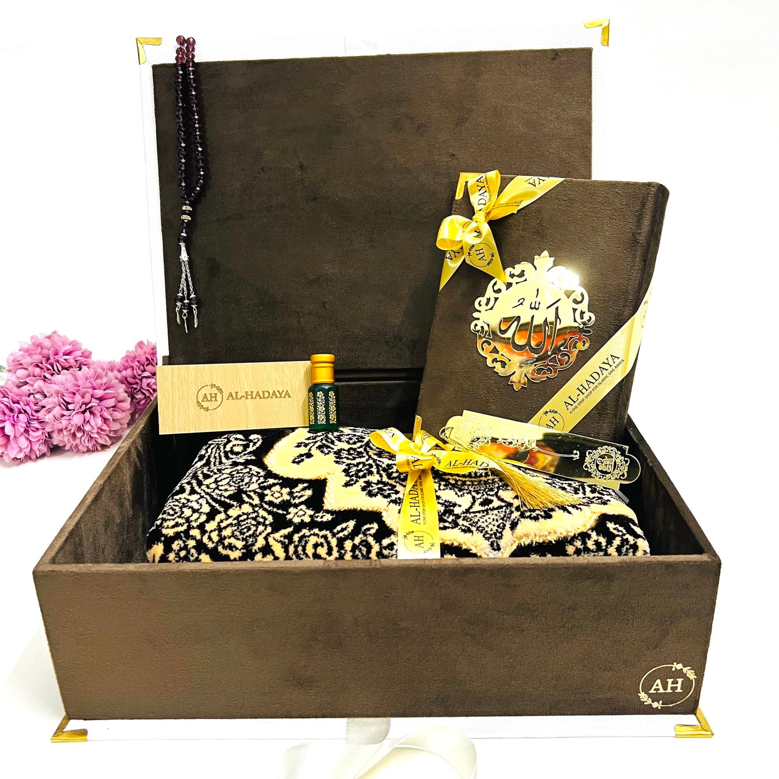 Featuring a soft touch, luxurious velvet covered Quran & Prayer Mat Gift Set in beautiful Chocolate Brown color with gold detailing.