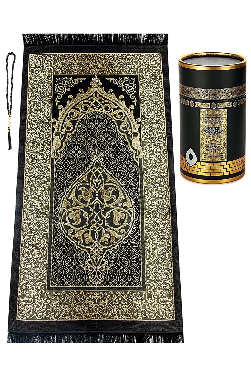 Elegant Kaba Design Cylinder Gift Box with Muslim Prayer Rug & Prayer Beads | Islamic Gifts Set | Prayer Carpet Mat, Taffeta Fabric, Black