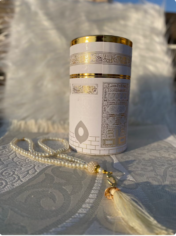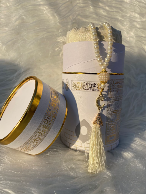 Islamic Gift Set | Kaba Design Cylindrical Gift Box with Luxe Taffeta Prayer Rug & Pearl Prayer Beads
