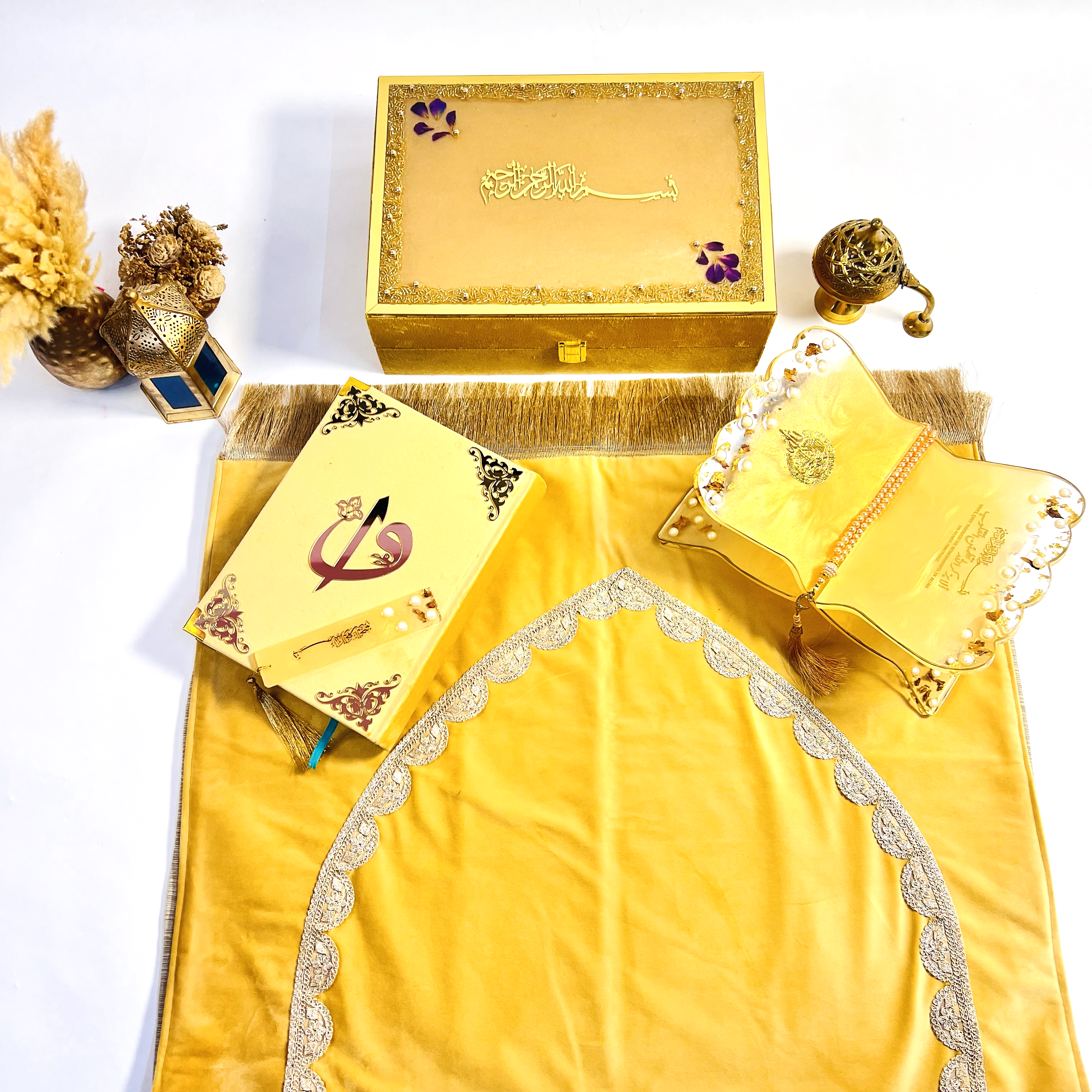 - Blissful Rehal (Made of Resin): Blissful resin rehal (Quran stand) to hold the Quran in style. The rehal is both sturdy and graceful, providing an elegant base for the Quran during recitation or display.