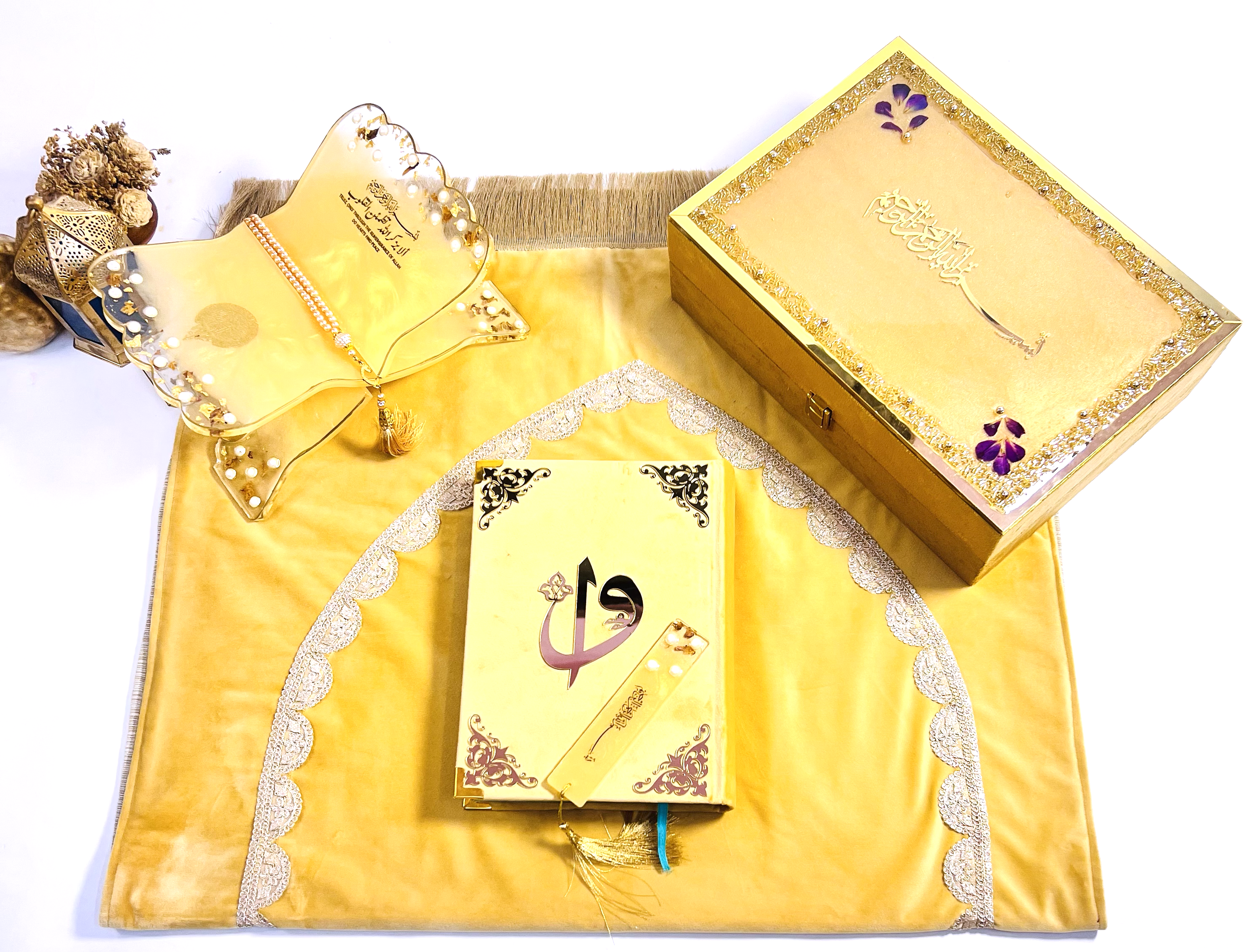 - Matching Tasbih and Tasbih Counter: A beautifully crafted tasbih (prayer beads) in golden hues along with a tasbih counter for ease in keeping track of prayers, offering both style and practicality.