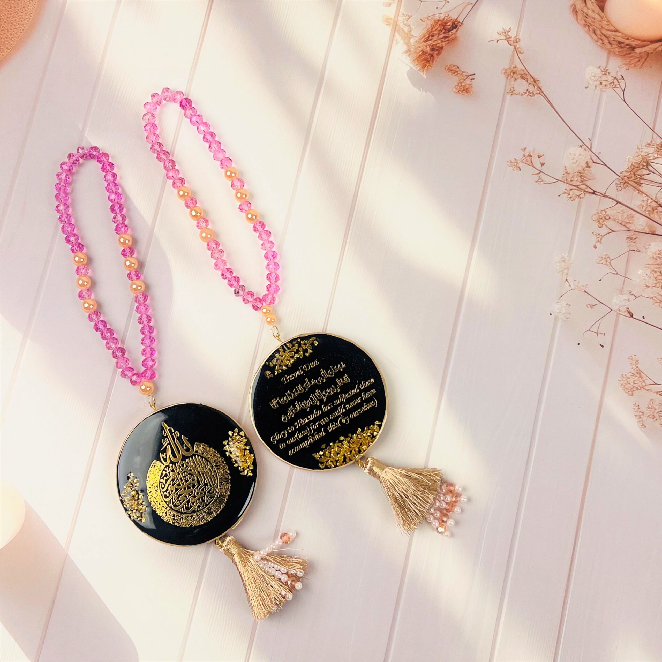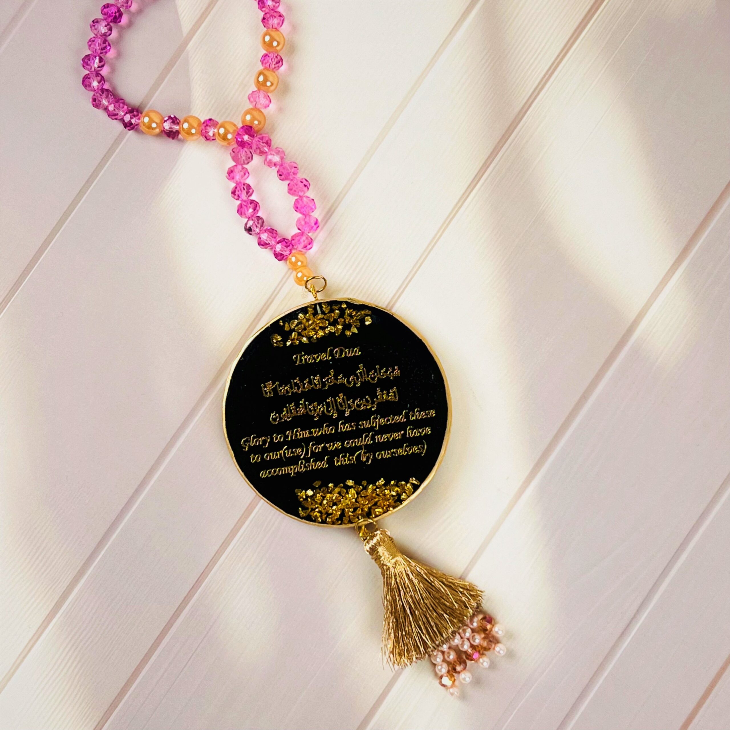 This car hanger is a meaningful accessory for any Muslim driver, offering the protection of the Travel Dua for safe journeys. The vibrant pink and peach beads, paired with luxurious gold accents, bring a harmonious blend of faith and style to your car’s interior. It’s a perfect gift for Eid, Ramadan, or any occasion, reflecting thoughtfulness and care for loved ones who travel.