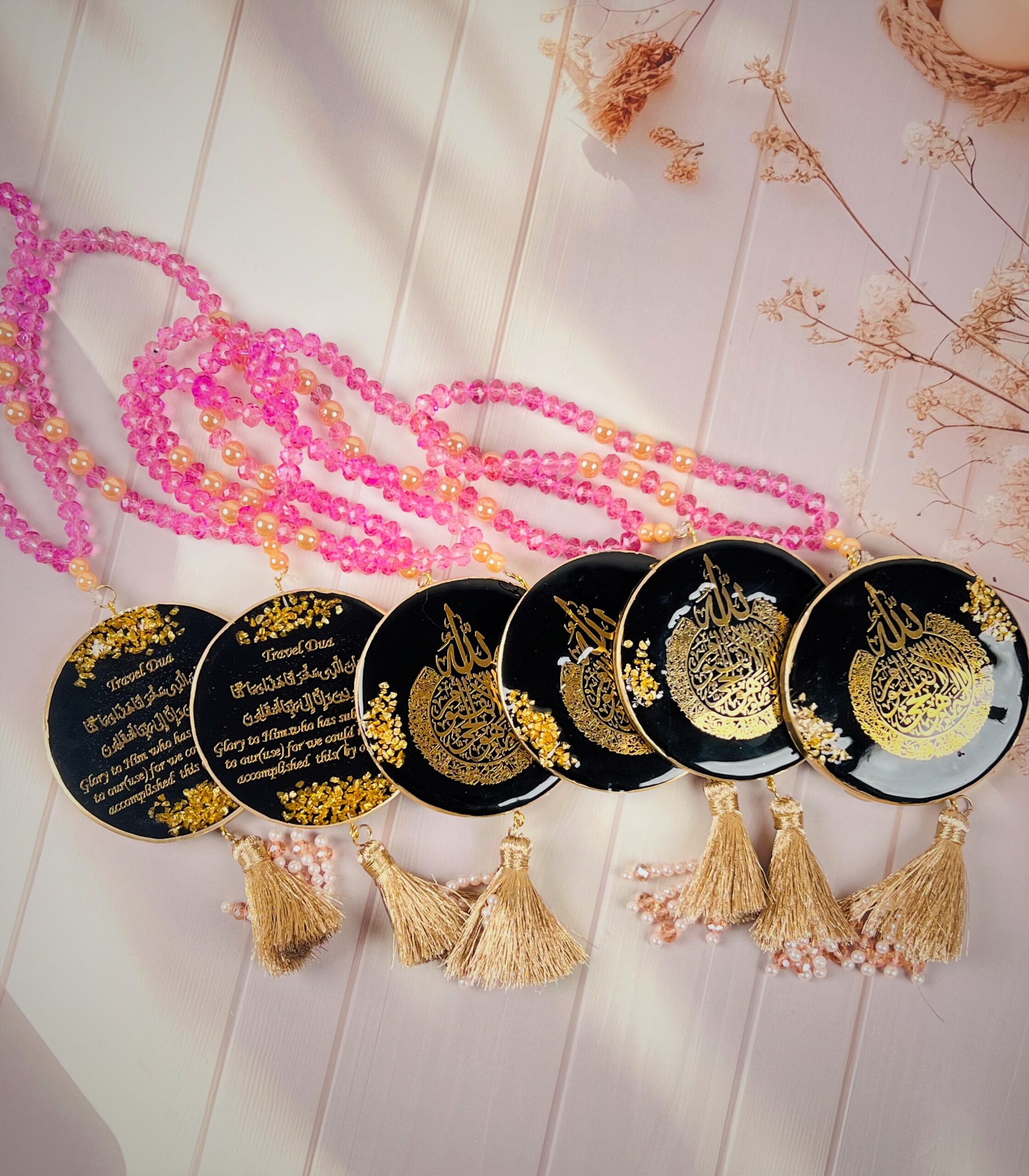 - Sacred Travel Dua Design: The circular pendant displays the Islamic Travel Dua in intricate gold calligraphy on a sleek black background, accented with delicate gold embellishments for a refined look.