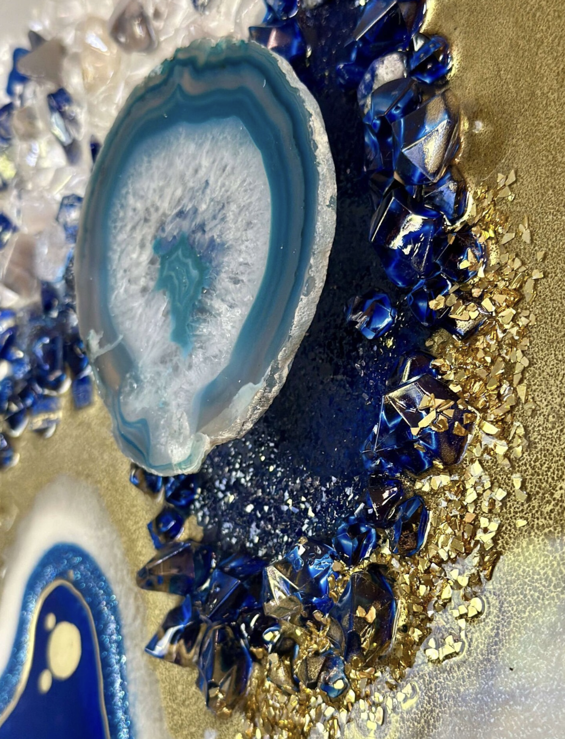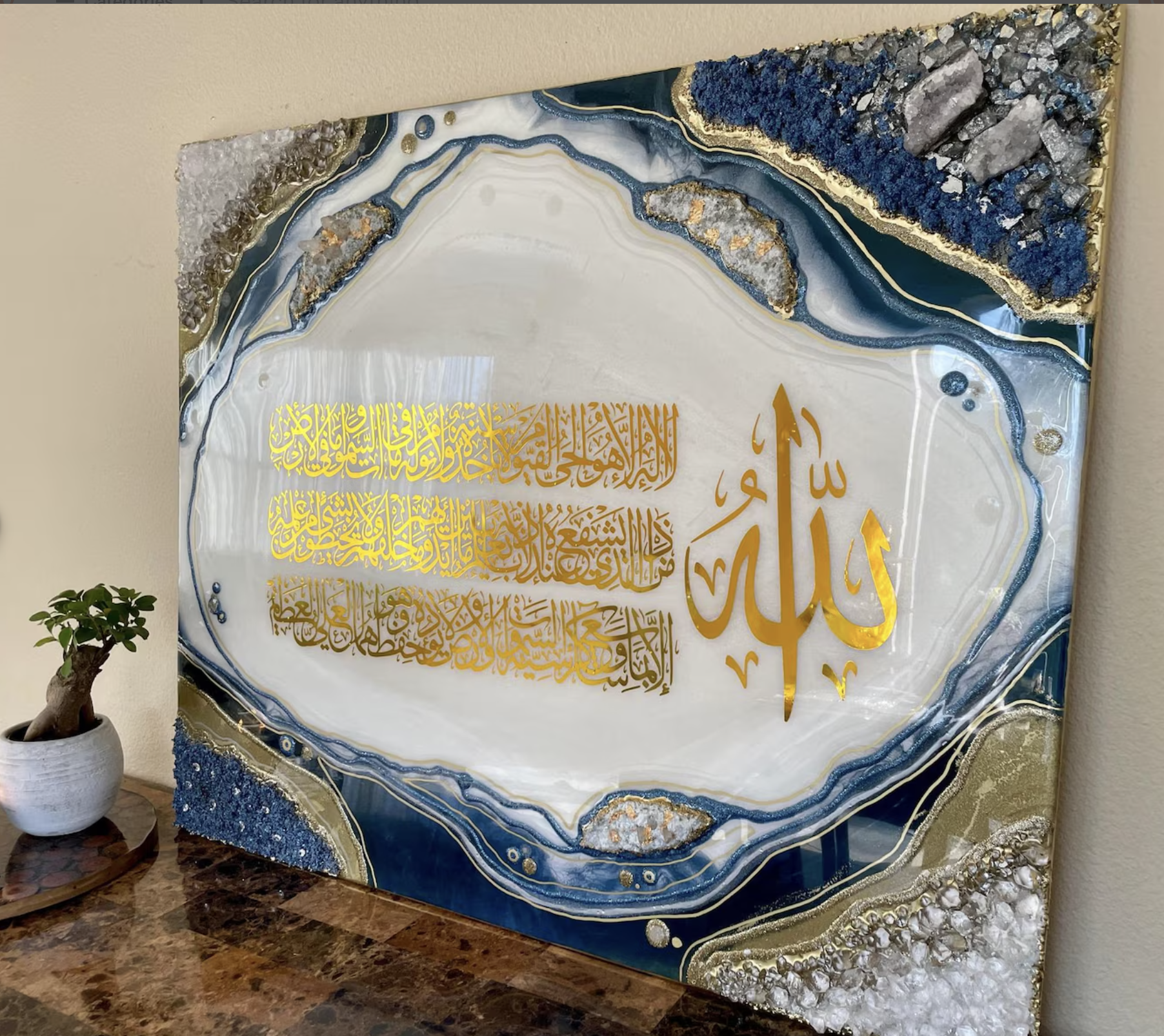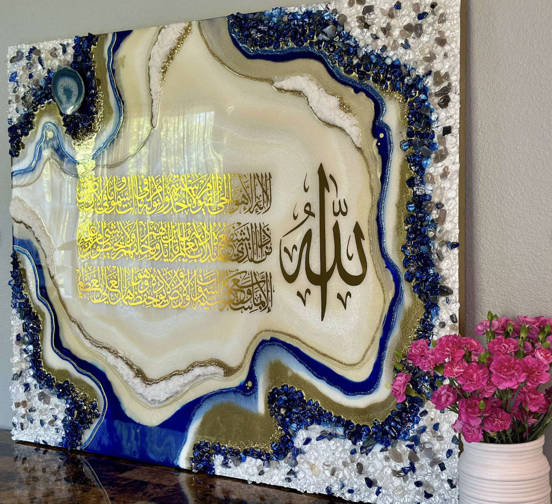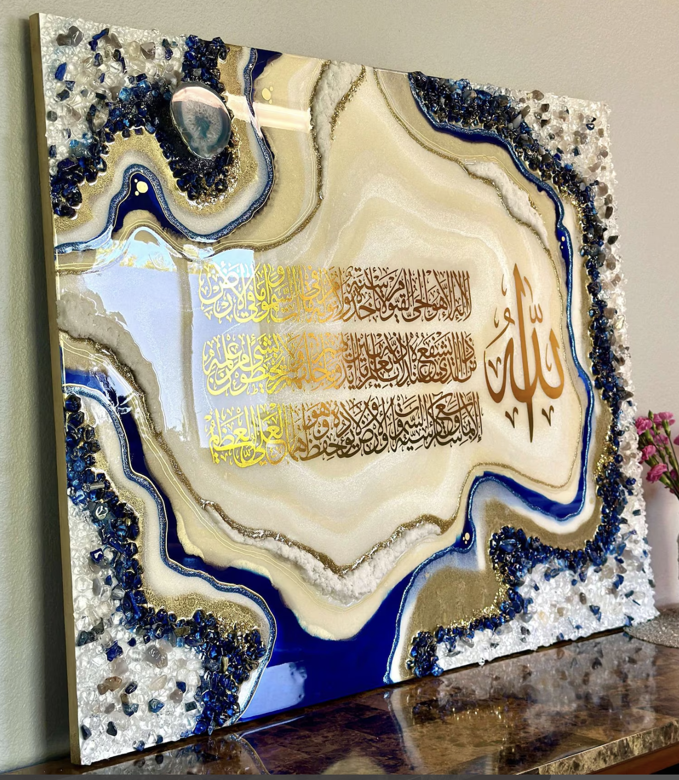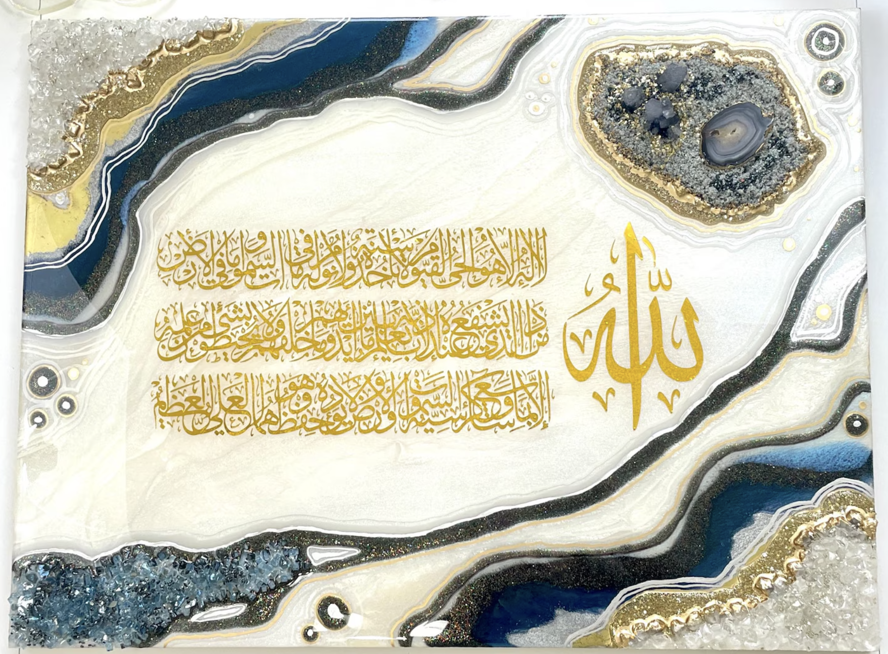 - Surrounding the calligraphy is a stunning geode resin art design, with colors inspired by nature’s precious stones—rich shades of blue, gold, white, and other natural hues that create a sense of movement and depth.