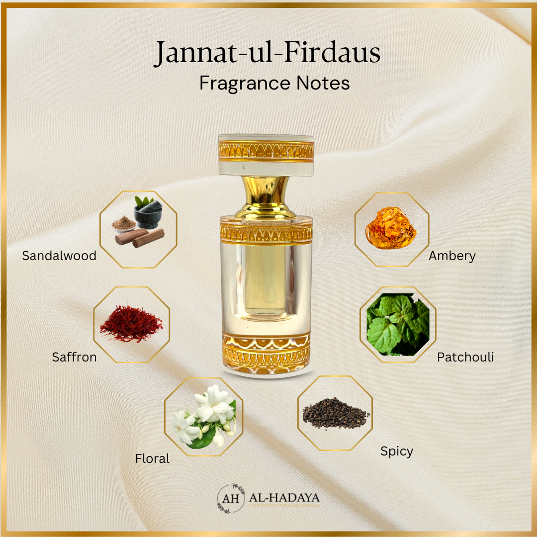 • Heavenly Fragrance: A unique blend of fresh green notes, floral undertones, and a hint of earthy richness, evoking the serene essence of Jannat (paradise).