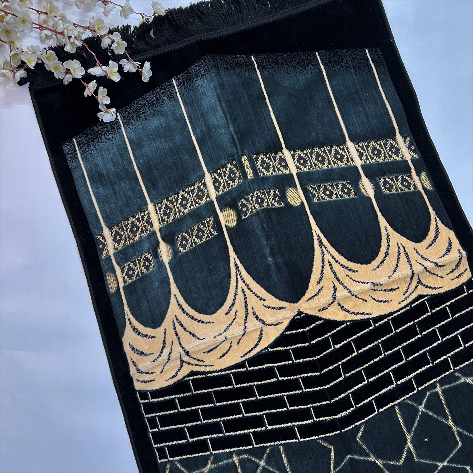 Made from the spirit of the kiswa of the kaaba sharif, which changes every year during hajj. the kiswa has a lot of meaning in the Islam religion, it is the cloth worn on the kaaba. people all over the world tend to touch the kiswa, but it is not that easy to even go near it. We make it easy for all the people who wish to see the kiswa from near. The same designs of kiswa have been imprinted on our luxurious Prayer mat range.