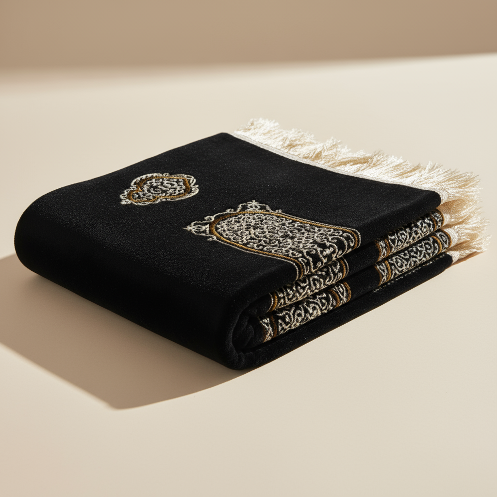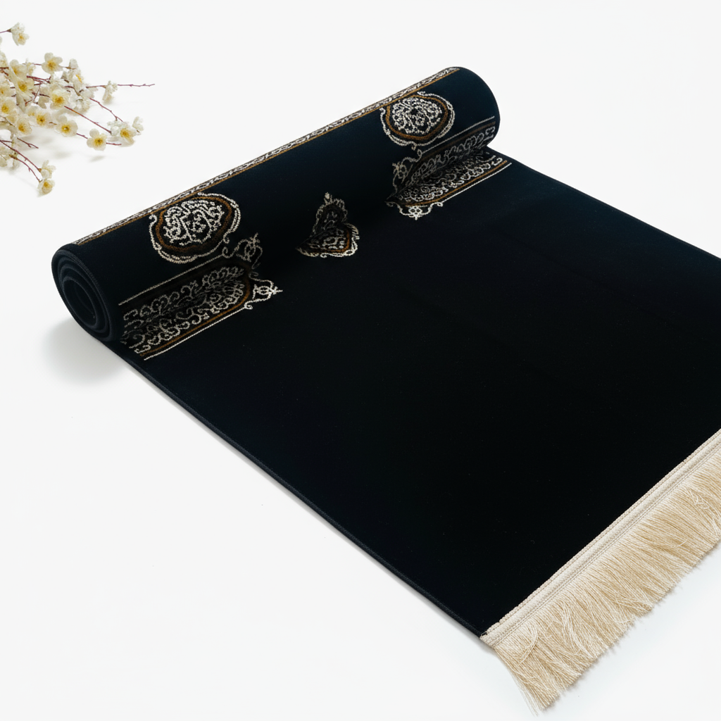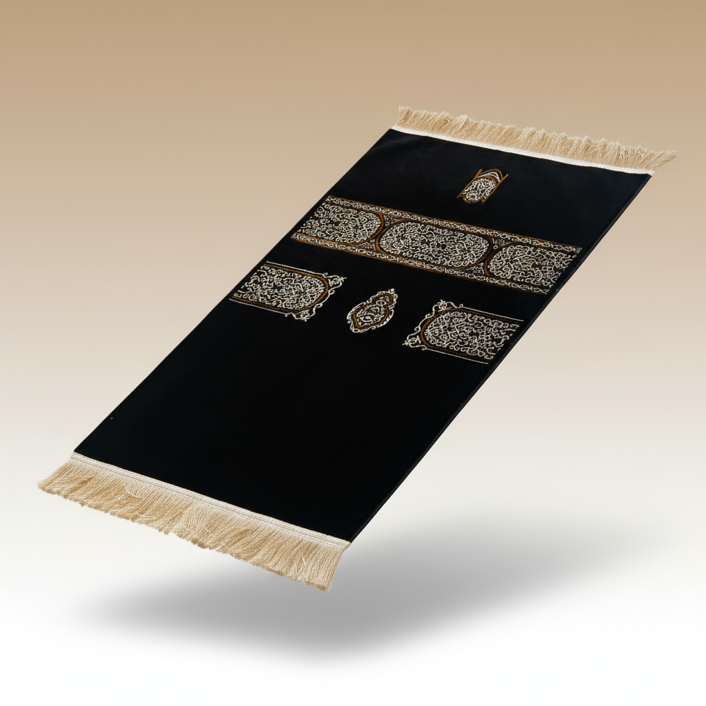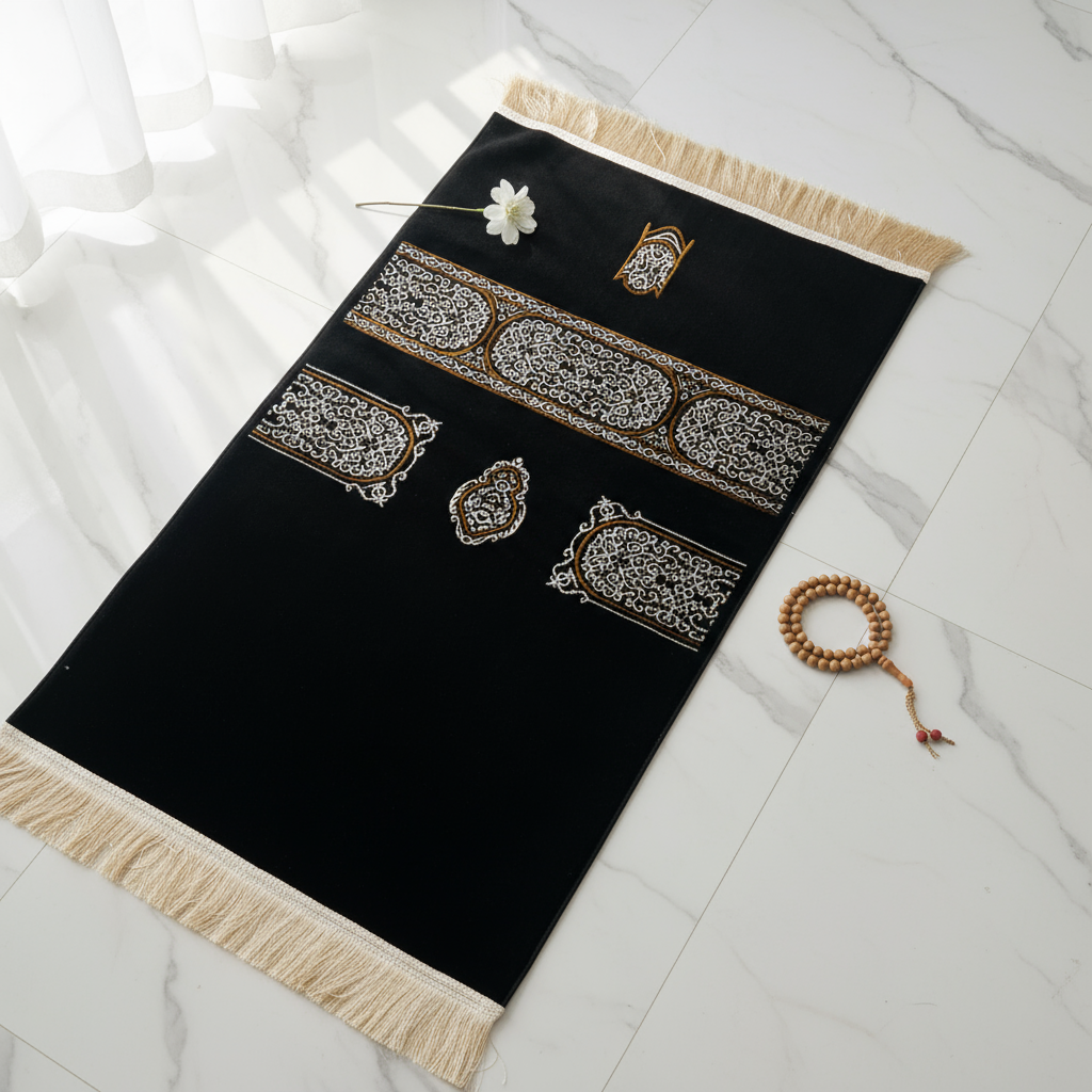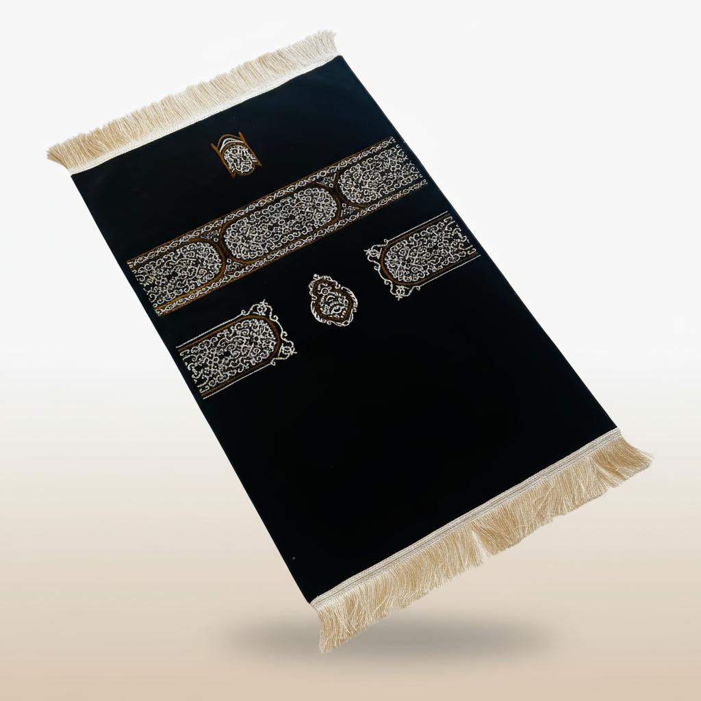 Luxury Chenille Kiswa Kaaba Islamic Prayer Rug | Premium Comfortable Black Muslim Prayer Mat