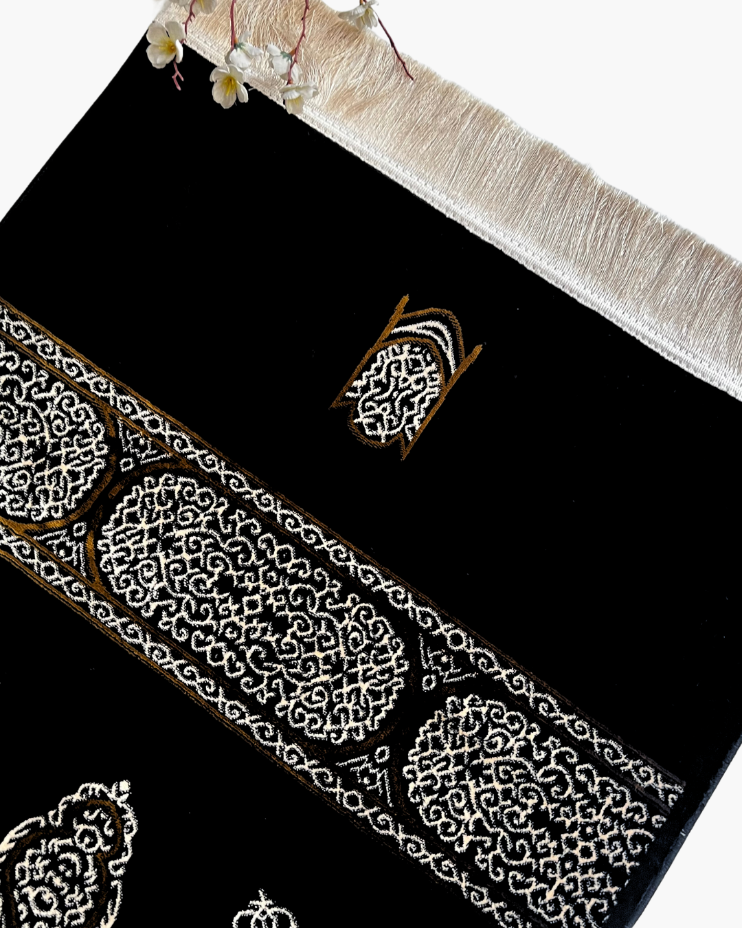 Made from the spirit of the kiswa of the kaaba sharif, which changes every year during hajj. the kiswa has a lot of meaning in the Islam religion, it is the cloth worn on the kaaba. people all over the world tend to touch the kiswa, but it is not that easy to even go near it. We make it easy for all the people who wish to see the kiswa from near. The same designs of kiswa have been imprinted on our luxurious Prayer mat range.