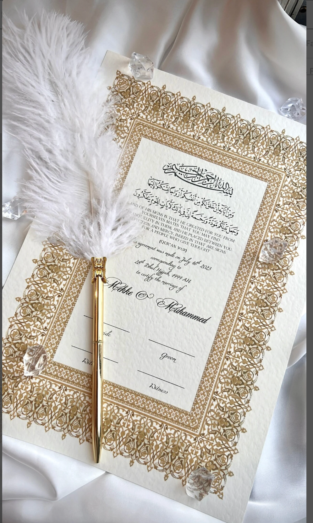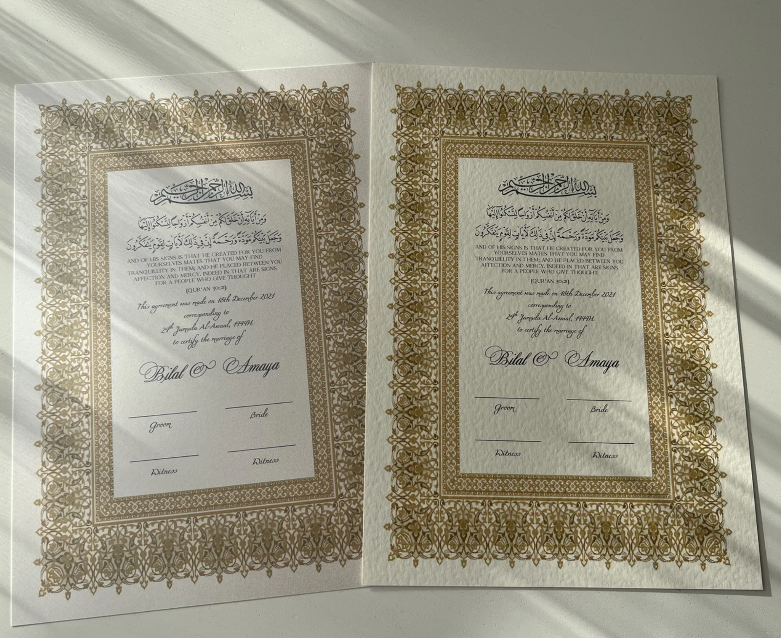 Al-Hadaya – Our designs have been inspired by Islamic arabesque, geometric and floral patterns featuring a blend of modernism whilst incorporating authentic and traditional Arabic text. Our beautiful and luxury Nikah Certificates have been carefully designed and personalised to be special for your Nikah occasion.