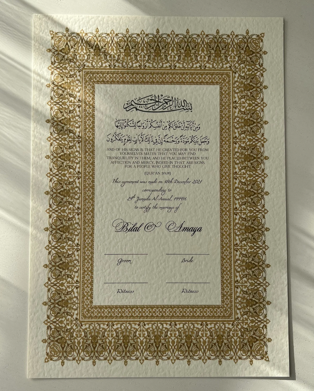 Luxury Nikkah Certificate Frame, Premium A3 Islamic Wedding Contract Frame , Nikkah Nama, Muslim Marriage Certificate With Quran Verse (30:21)
