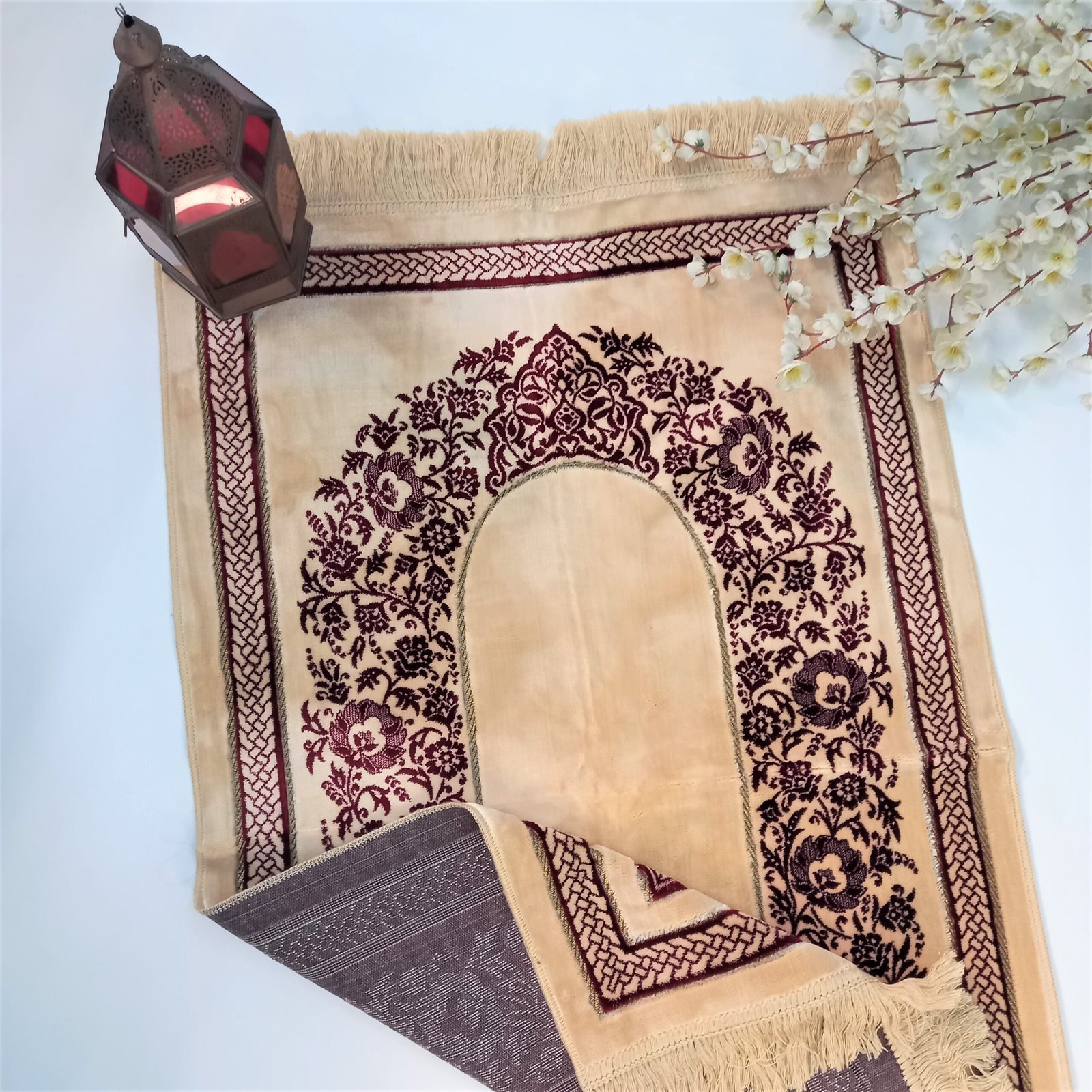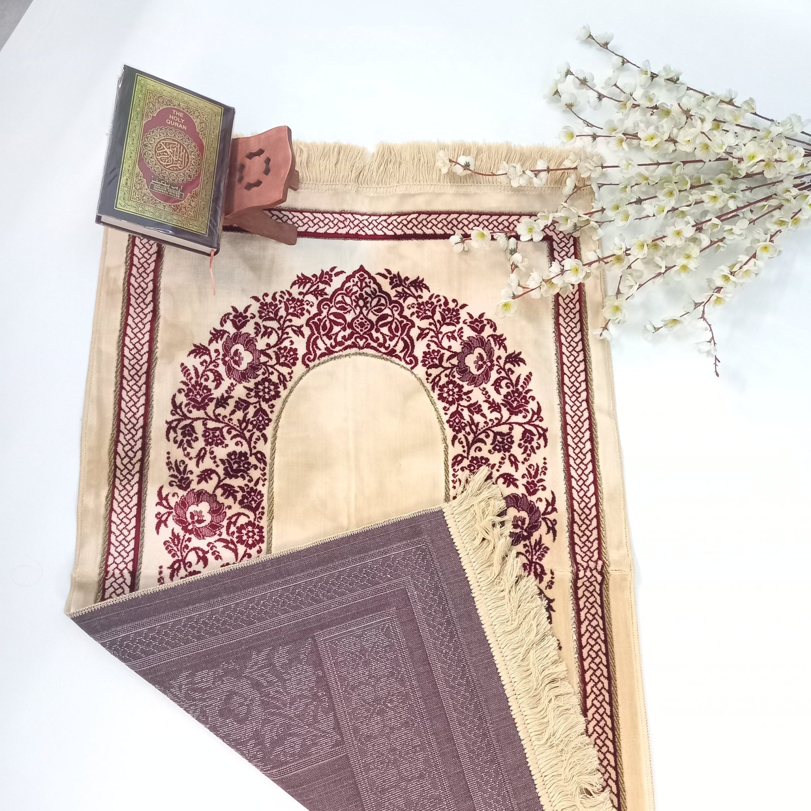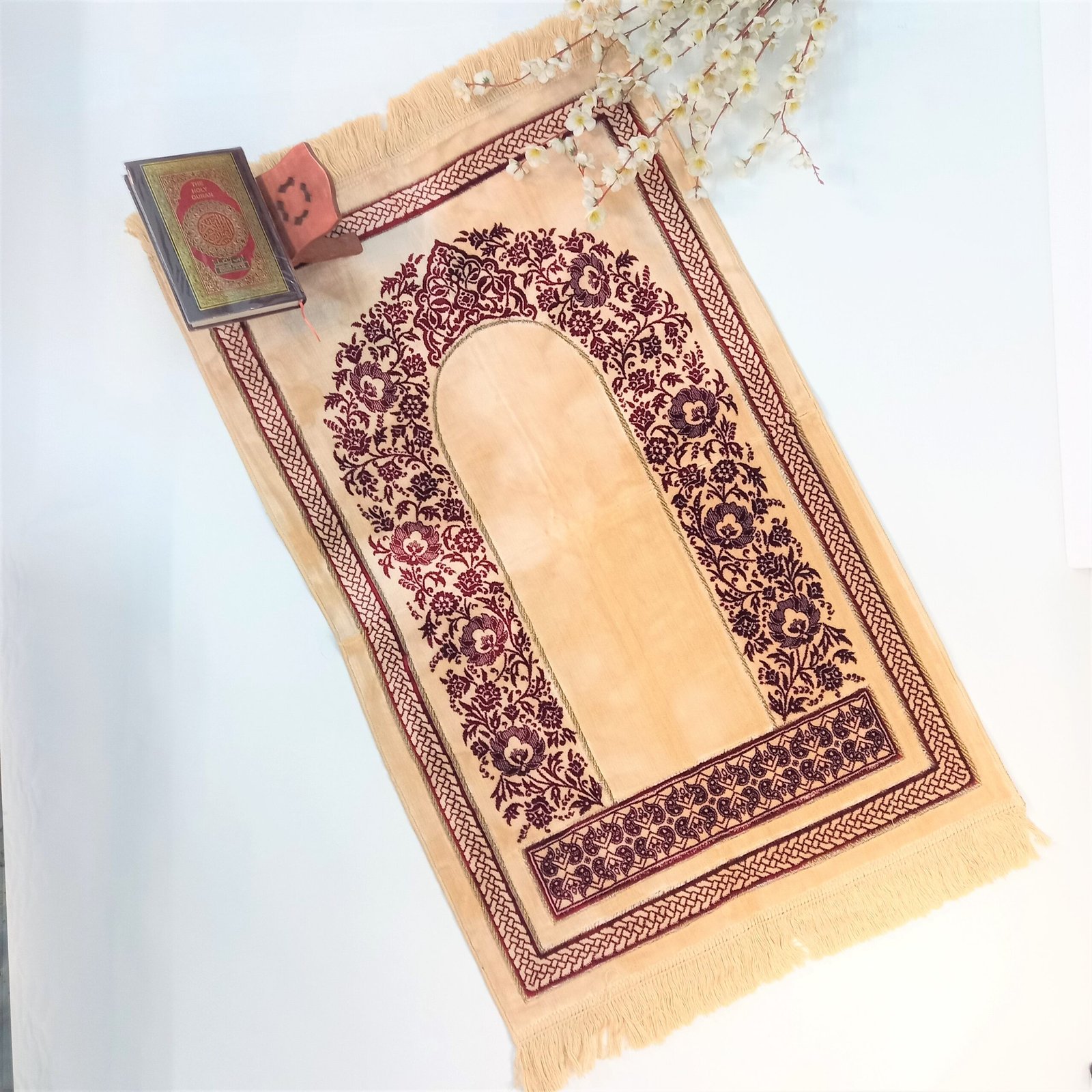 These prayer rugs are high quality, and meant to last. Performing salat on one of these janamaz will surely enhance your experience. Our beautiful Turkish rosewood tint floral pattern Muslim prayer Mat is suitable for many occasions. Ramadan, Eid, Hajj, Umrah, Wedding/Nikah, Aqiqa and any other special occasion., etc., making your occasion so unique and impressive — the list goes on.