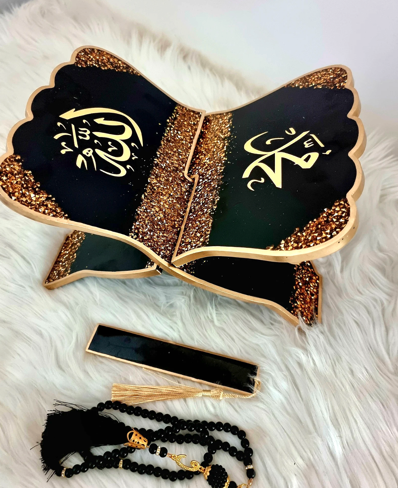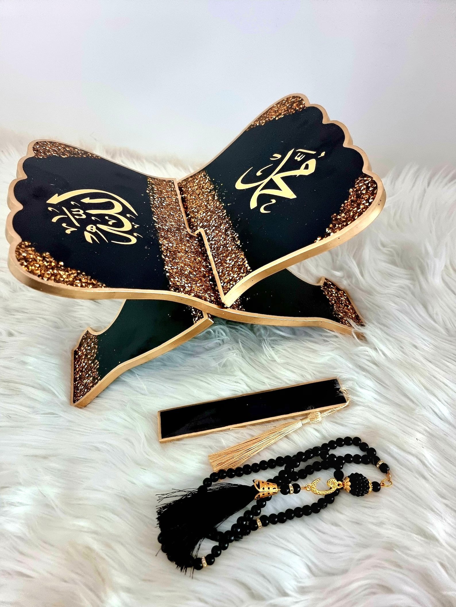 Personalised Black and Gold Quran stand with matching bookmark and Turkish Tasbeeh