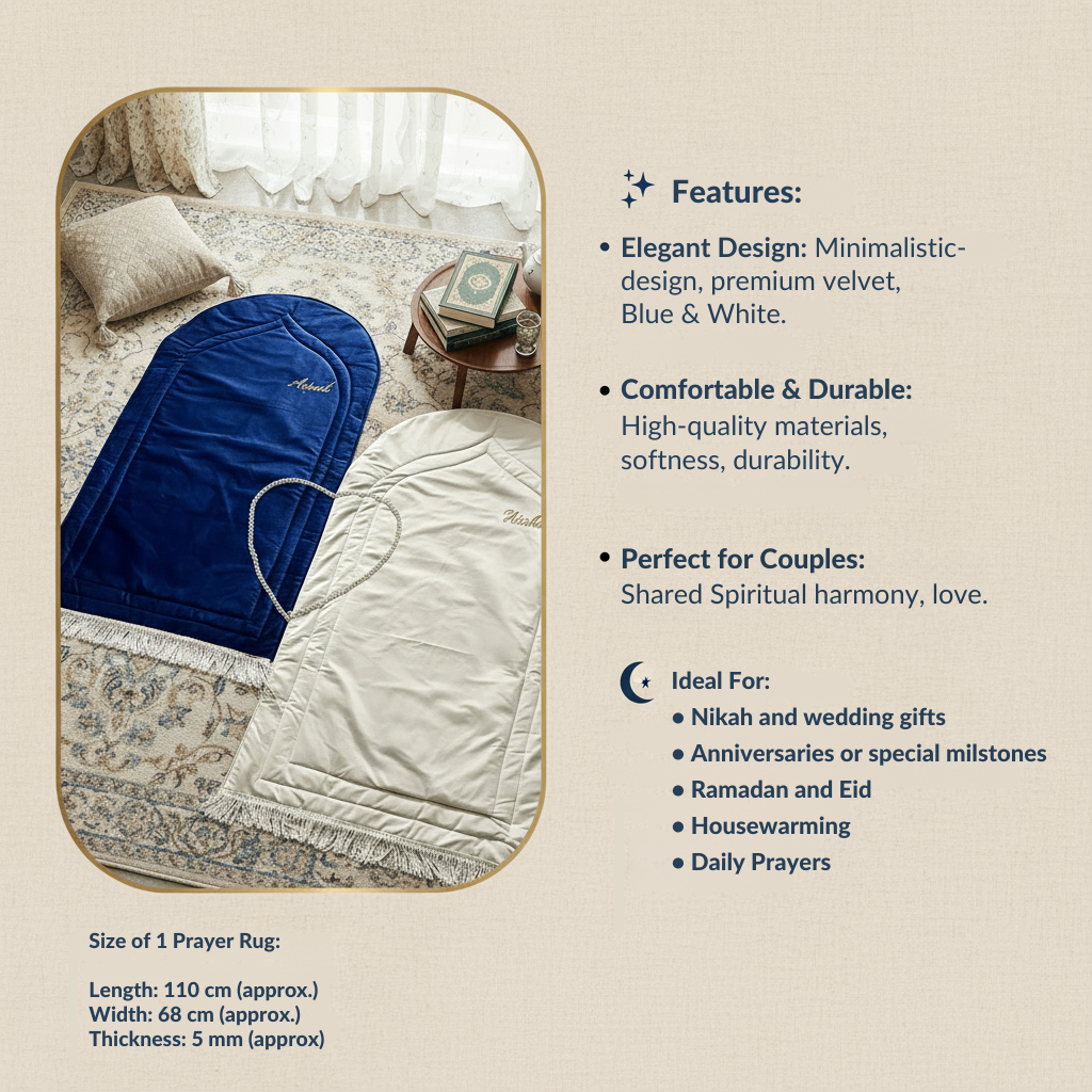 Introducing Personalised Luxury Blue & White Couple Prayer Rug Set a range of Premium Handmade Velvet Prayer Mats