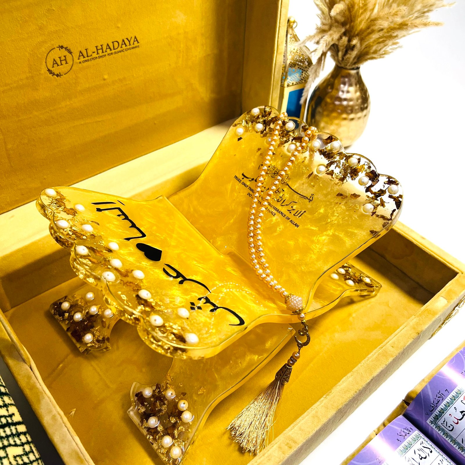 - Blissful Rehal (Made of Resin): Blissful resin rehal (Quran stand) to hold the Quran in style. The rehal is both sturdy and graceful, providing an elegant base for the Quran during recitation or display.