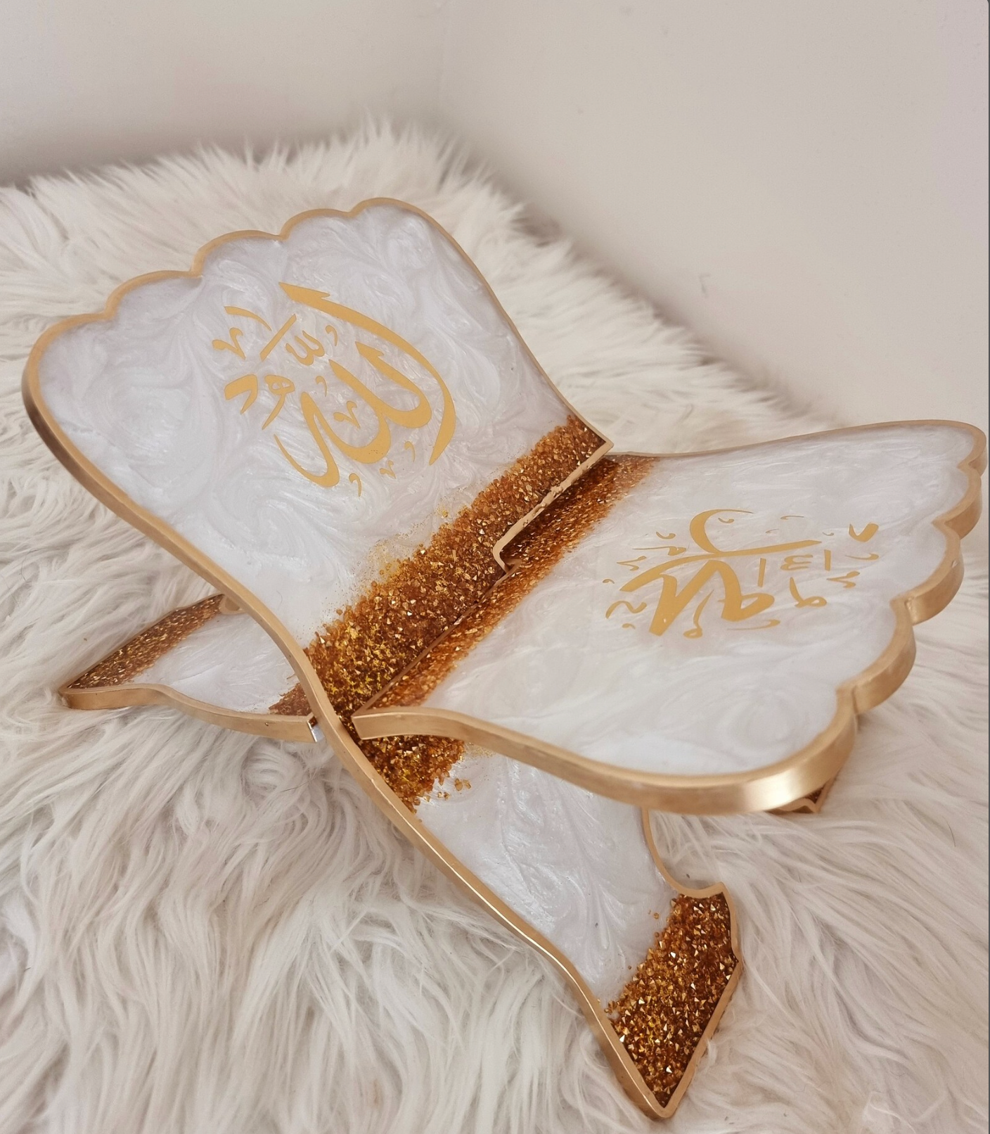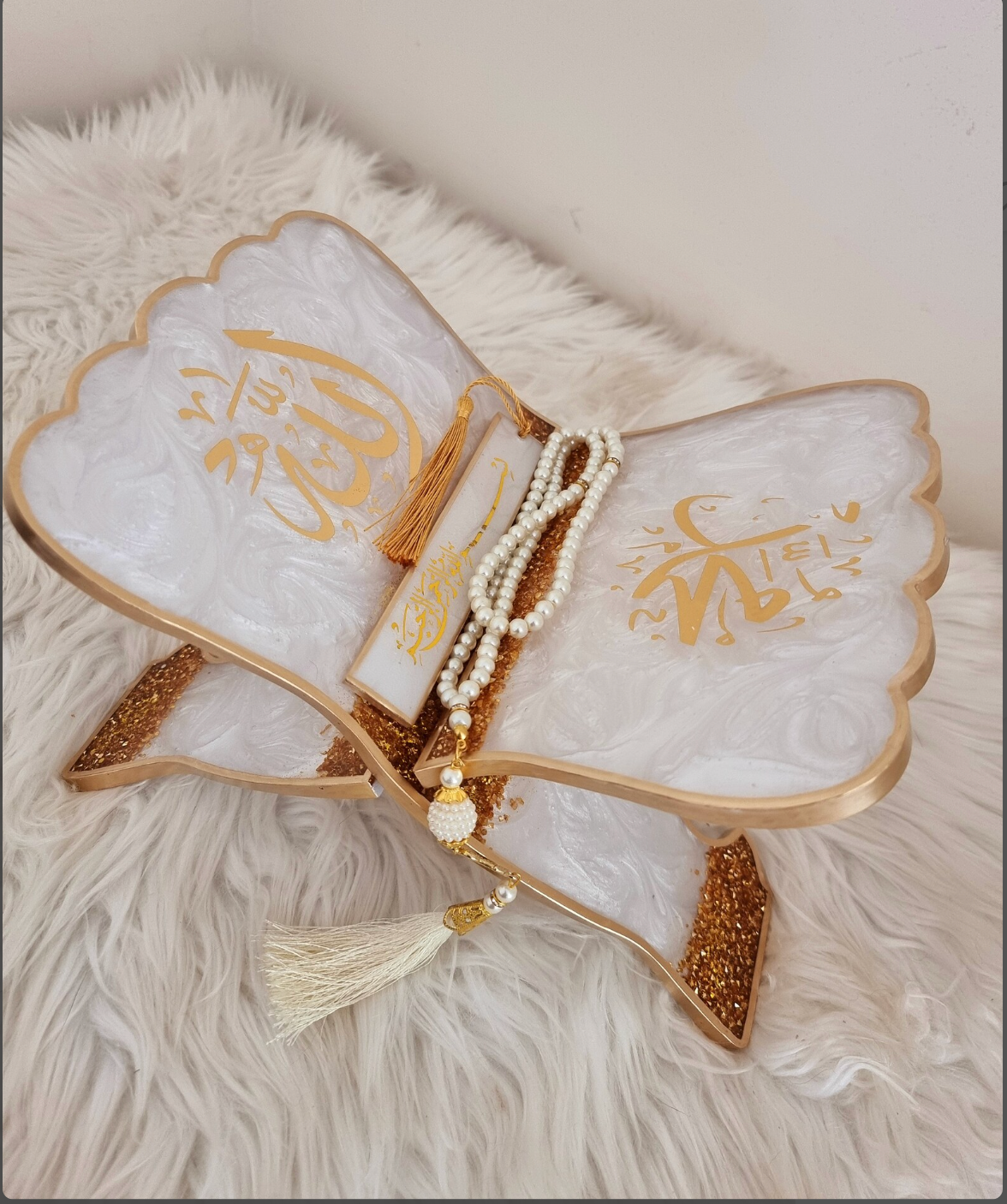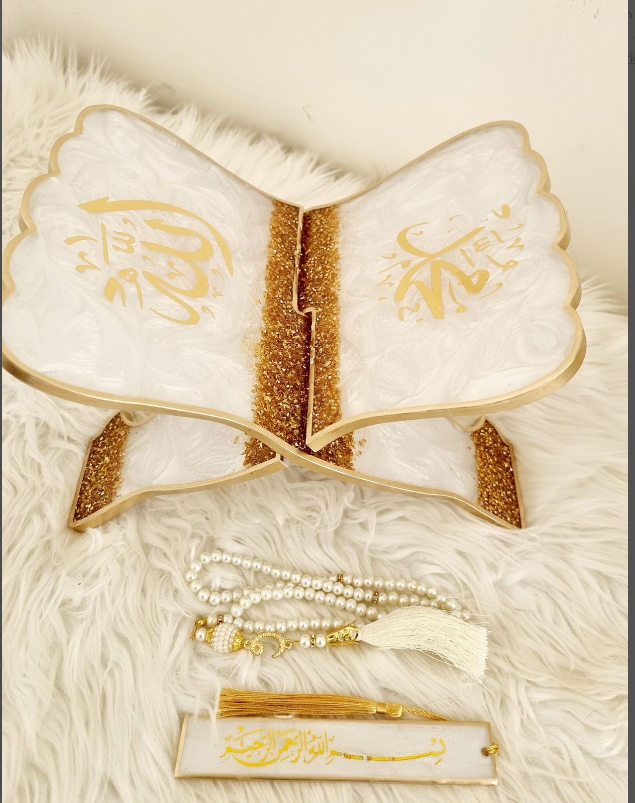 Resin art Islamic Quran holder stand with Personalised White and Gold Quran Karim stand with matching bookmark and Iqra tasbeeh