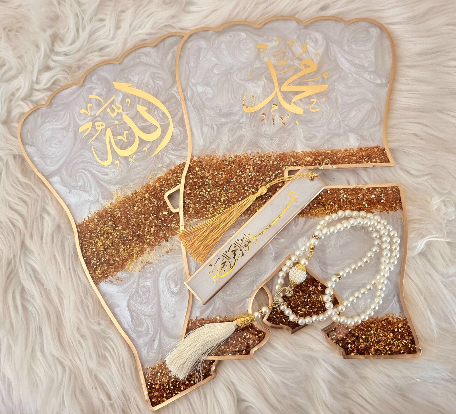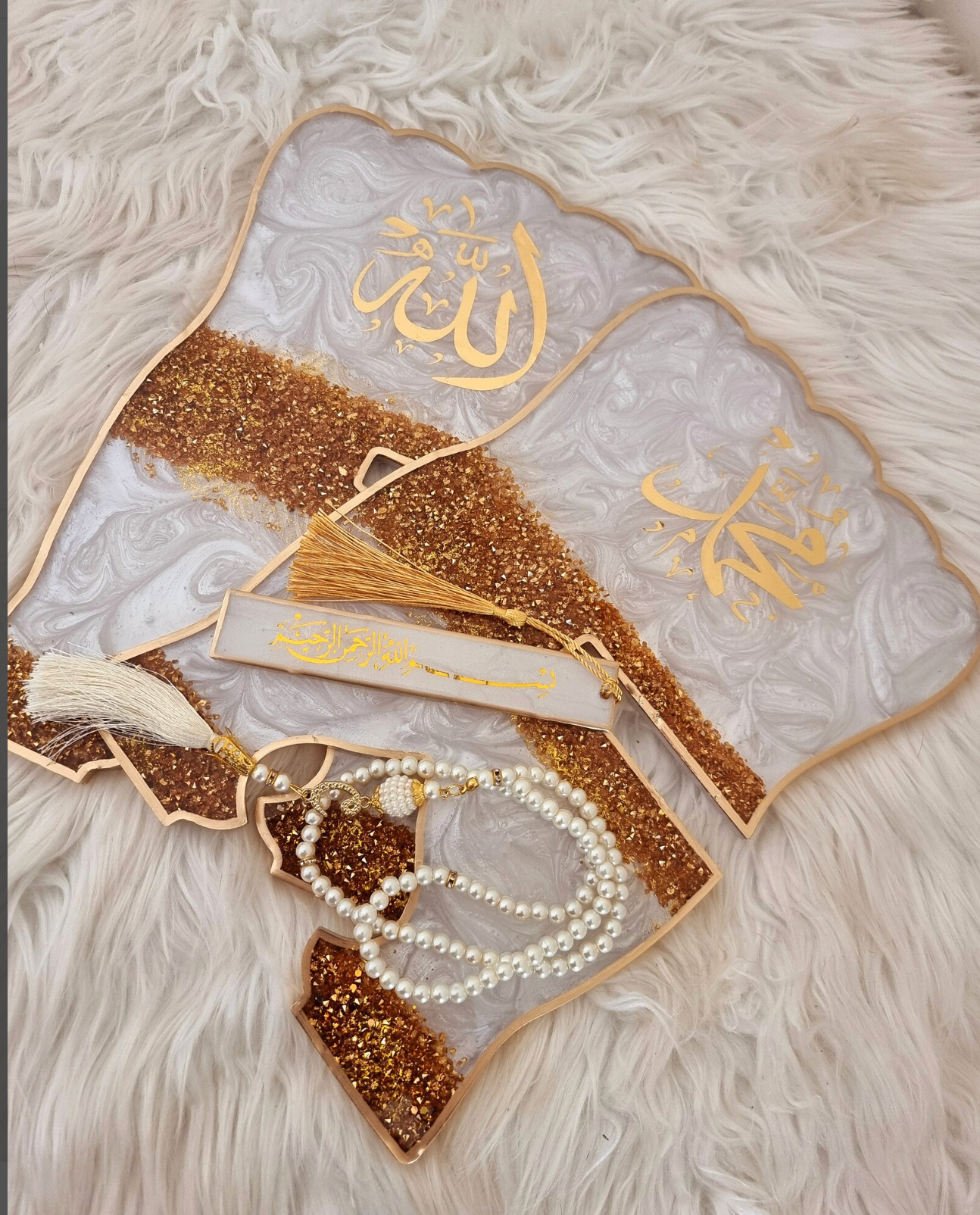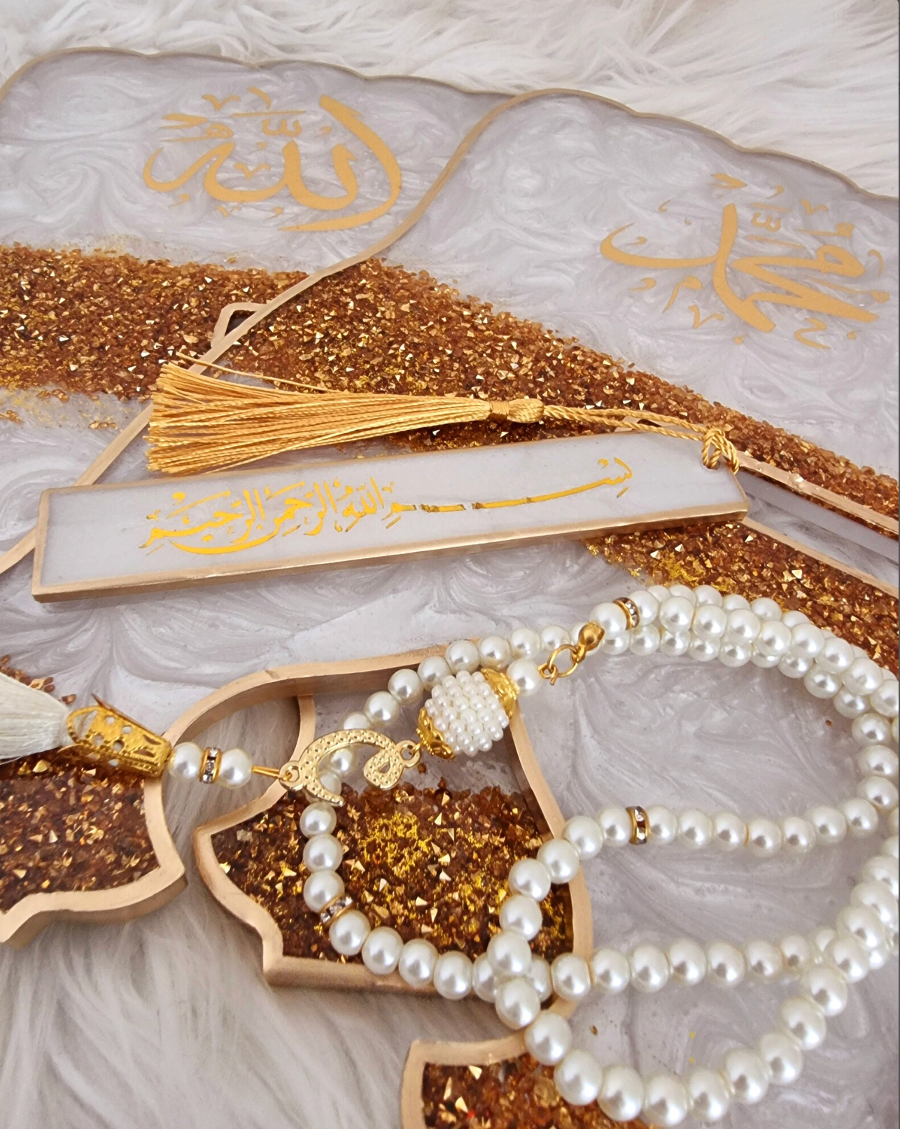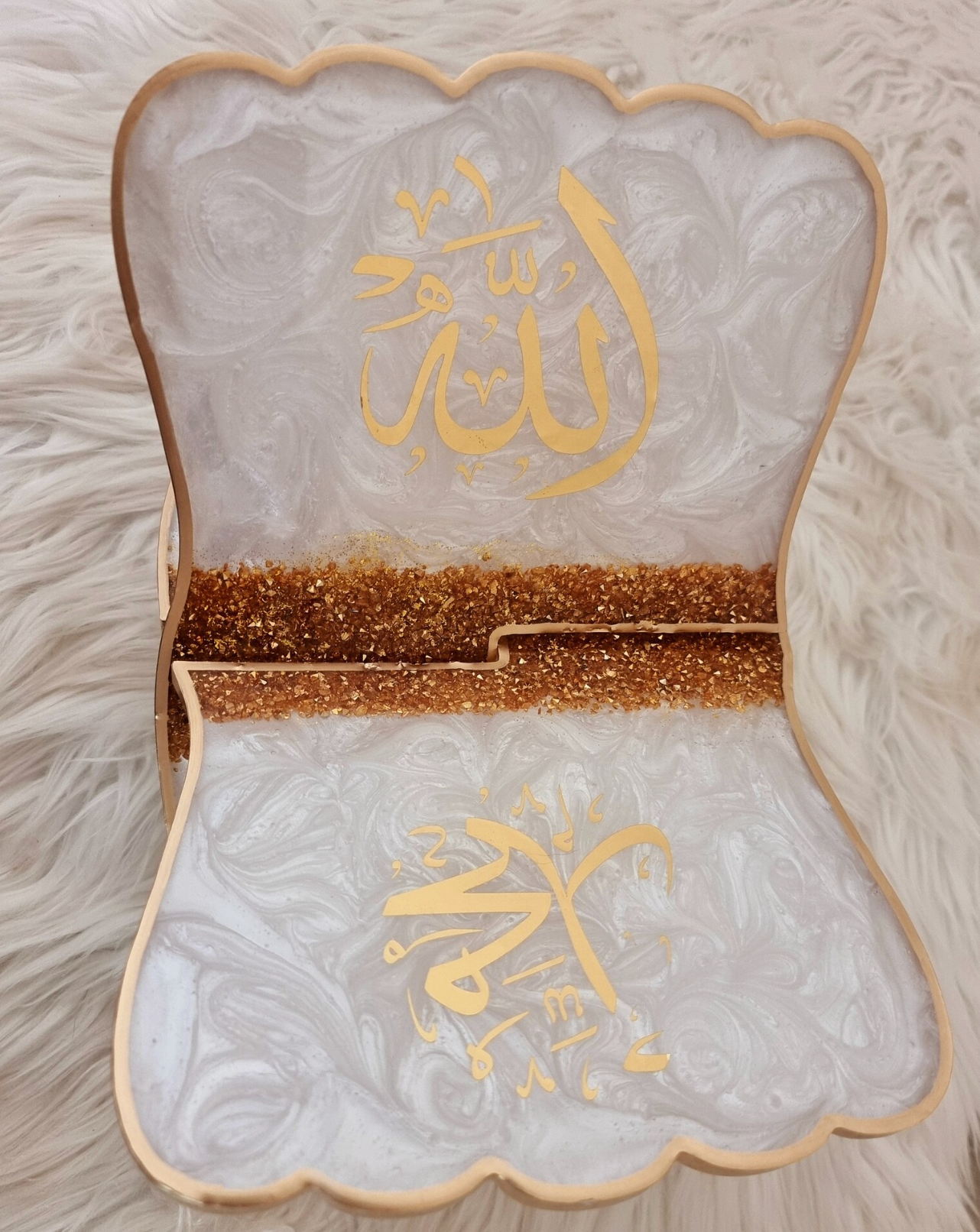 Resin art Islamic Quran holder stand with Personalised White and Gold Quran Karim stand with matching bookmark and Iqra tasbeeh