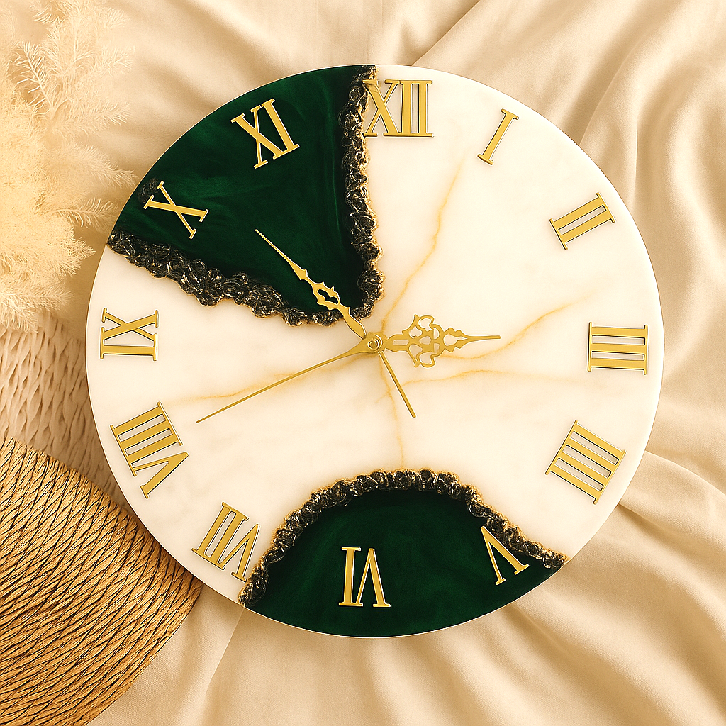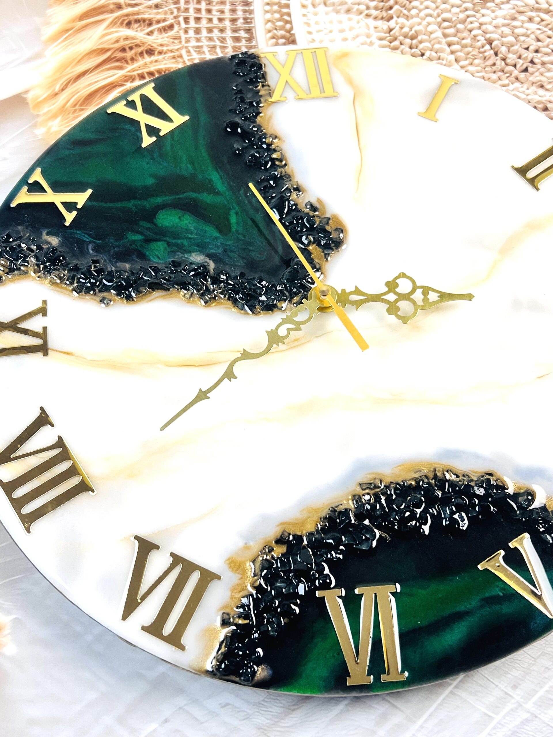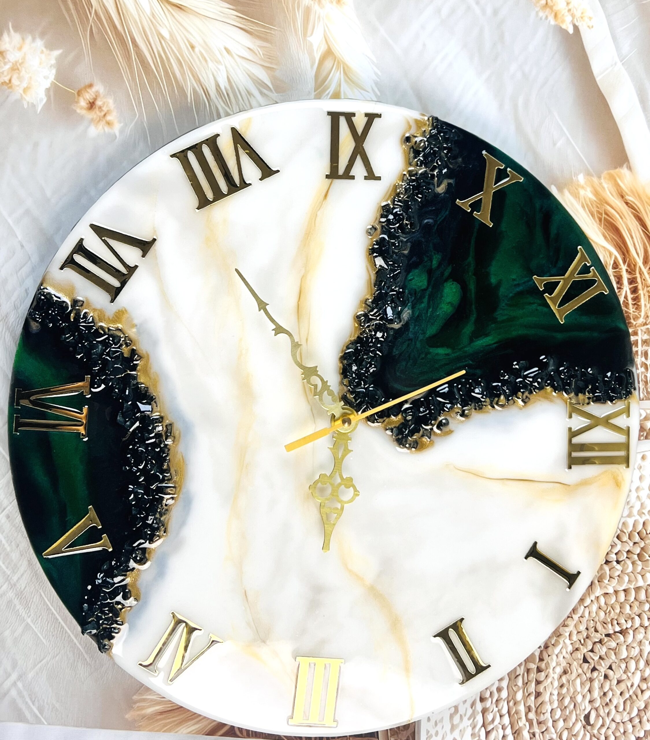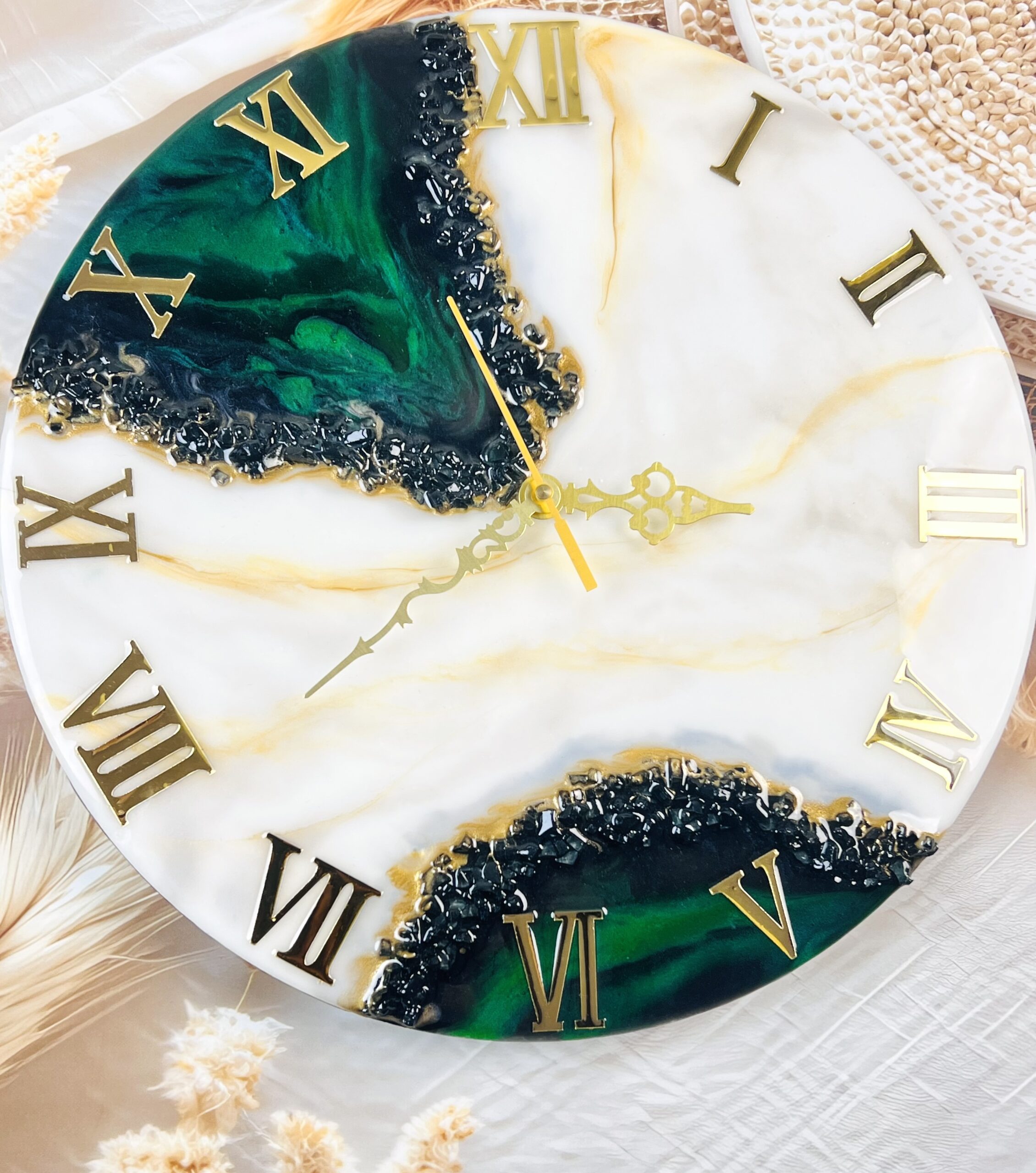 This stunning handmade resin wall clock is available in various sizes and is made using crystals pigments and gold ink. Custom sizes are also available.