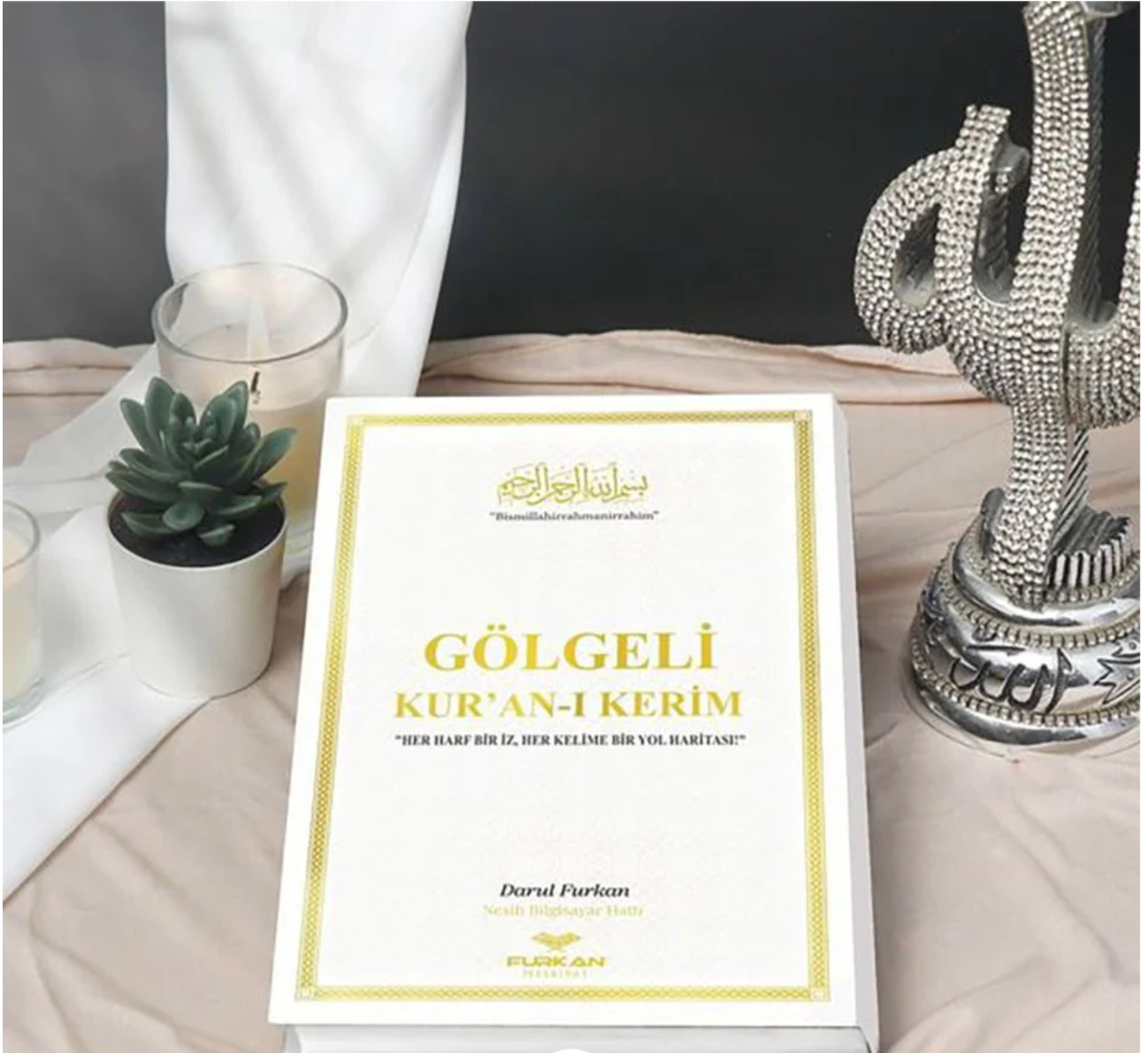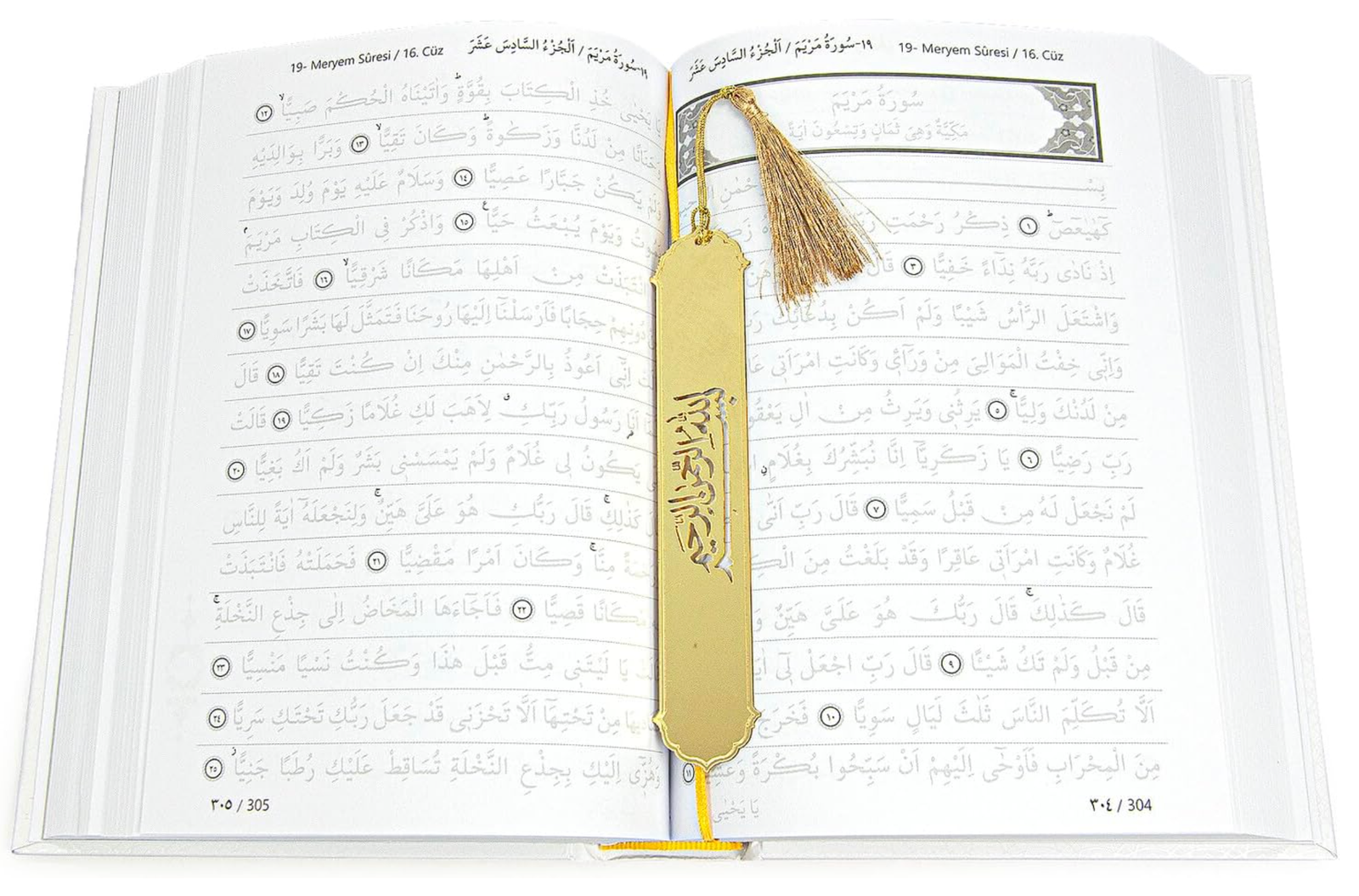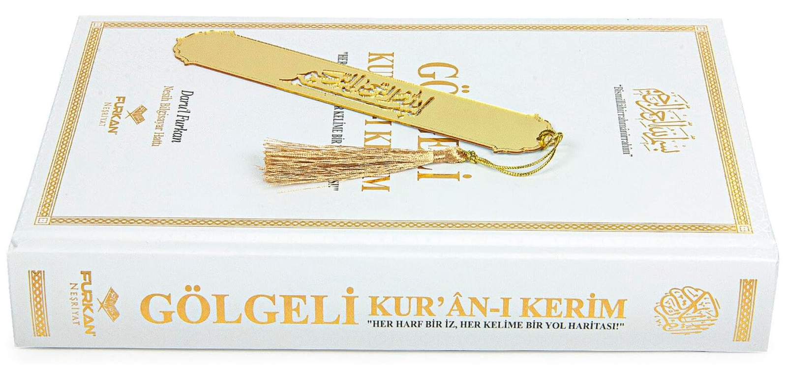 • Comes with a gold bookmark that has a cutout of the Basmala in the middle and a gold tassel at the top.